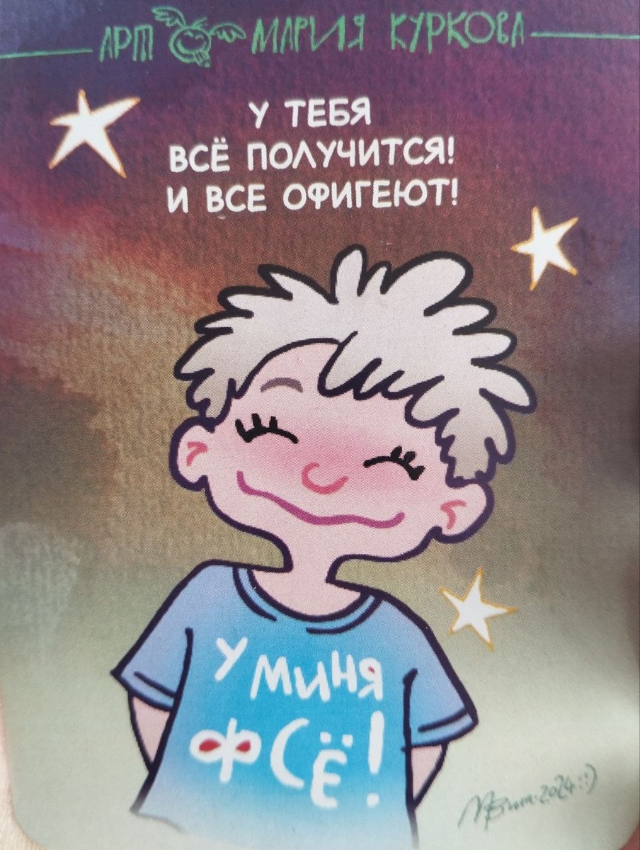 Хороший знак выпал сегодня нам. Если честно, я проснулась в растрепаных чувствах.😱 У меня готова вторая книга и я тут сильно думаю куда с ней идти и как ее слать. Информация пришла такая: эксмо берет с авторов полляма. 🙈 Издательства сидят на своих Пелевиных и Донцовых и новых авторов в этих реалиях раскручивать им невыгодно. В общем, я грустно думала о том, что мой выход на новый уровень кажется не состоится, и хорошо , хоть можно выйти по- старому, но хочется то по-новому и тут вспомнила, что не тащила карту дня для моих ненаглядных вас, а тут, вона что. Спасибо туда 👆 ободряет ))