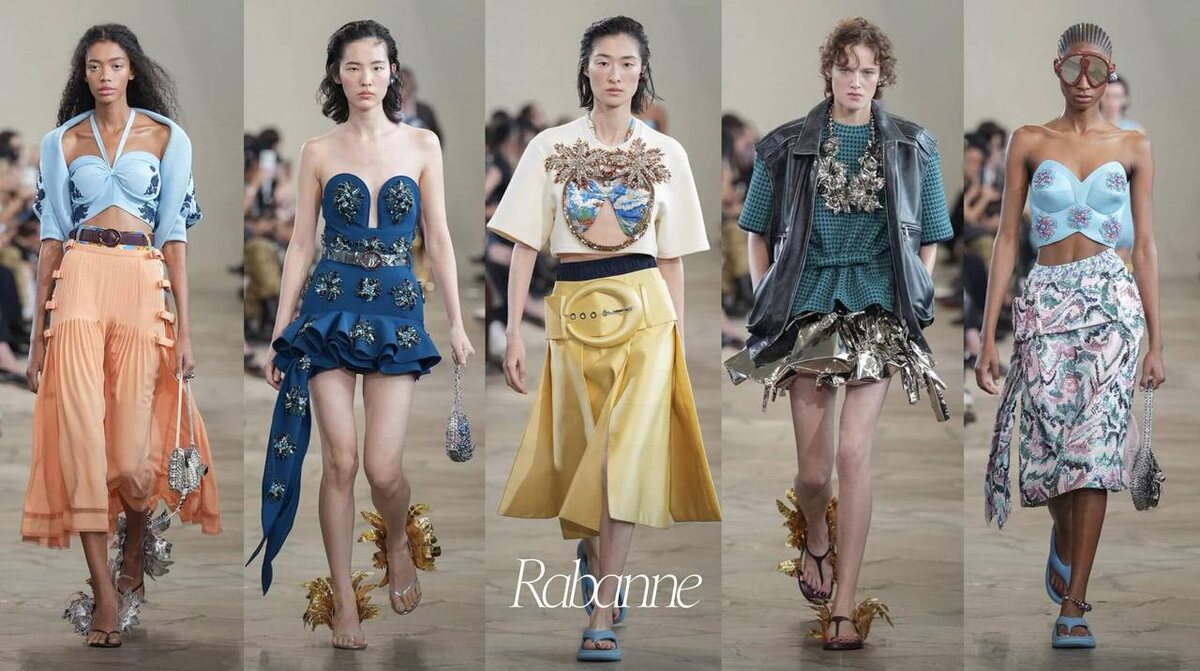 RABANNE SS 2026 Жюльен Доссена воссоздал стиль 1950–60-х, вдохновляясь фильмом "Ребенок Розмари" и "степфордскими женами". Он использовал винтажные купальники, необработанные края, 3D-цветы и кожаные корсеты. Платья были распахнуты, показывая купальники под одеждой. Круглые вырезы и темные гавайские принты придавали образам элегантность. Доссен стремился создать женственность с элементами легкомысленности.