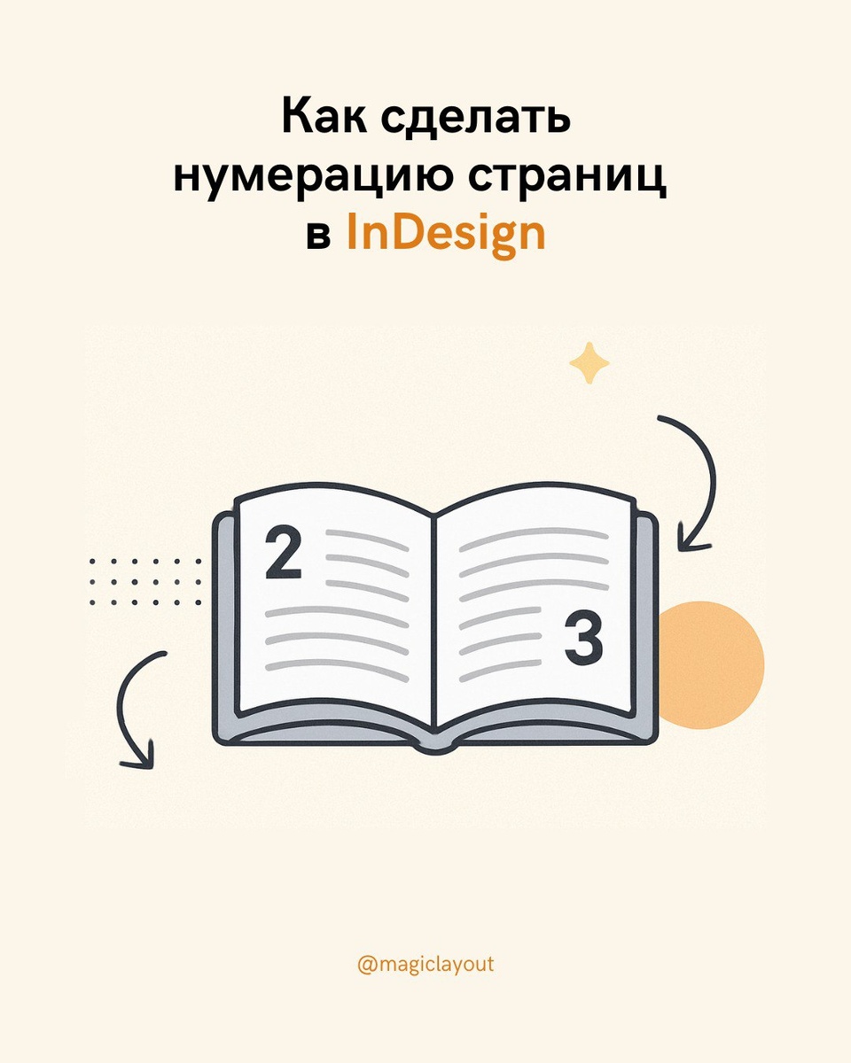 📖 Как в InDesign сделать нумерацию страниц Нумерация — обязательный элемент книги, журнала или каталога. В InDesign её можно настроить один раз через мастер-страницы, и программа сама пронумерует весь документ. 🔹 Шаг 1. Открой панель Pages • Window → Pages (Окно → Страницы) • Вверху панели будут мастер-страницы (обычно A-Master). 🔹 Шаг 2. Добавь нумерацию • Дважды кликни по A-Master. • Нарисуй текстовый блок внизу страницы. • Меню: Type → Insert Special Character → Markers → Current Page Number (Текст → Вставить специальный символ → Метки → Текущий номер страницы). 👉 Появится буква «A» — это метка номера. 🔹 Шаг 3. Настрой оформление • Выбери шрифт и размер; • Размести номер слева, справа или по центру; • Для разворотов: слева номер слева, справа — справа. 🔹 Шаг 4. Применяй мастер-страницу • Просто перетащи A-Master на нужные страницы. • Теперь нумерация обновляется автоматически ✨ 🔹 Дополнительно • Хочешь начать не с 1-й страницы? Панель Pages → Numbering & Section O