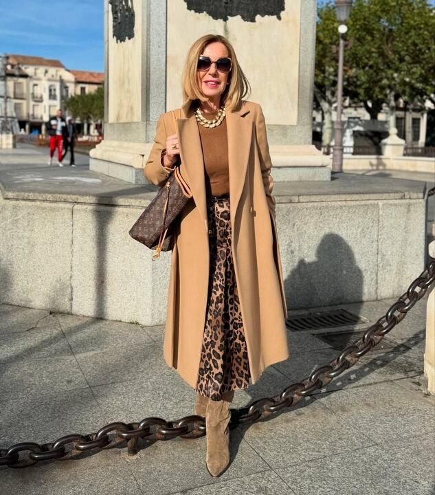 Почему-то в нашем обществе до сих пор живы стереотипы о том, что в зрелом возрасте следить за модой и стилем уже поздно. Надо одеваться попроще и поспокойнее: намодничалиь уже. Но правда в том, что никакой волшебной кнопки "пора завязывать с модой" просто нет. Модной, стильной и красивой можно быть абсолютно в любом возрасте. Однако если в определенный момент меняется самоощущение женщины, и остромодные тренды кажутся неподходящими, всегда можно выбрать что-то интересное, но не экстремальное. И сегодня я хочу показать вам стильные образы на осень, где нет ничего шокирующего. Начать хочется со спокойного нюдового образа в, как сейчас можно говорить, натуральных оттенках. Это бежевый, коричневый и рыжевато-коричневы цвета. Такие образы всегда выглядят элегантно и уместно, однако есть одно маленькое но: с ними очень легко скатиться в однообразие и монотонность. Чтобы этого не происходило, такие образы хорошо разбавлять золотом или золотой бижутерией, а еще анималистическими принтами в