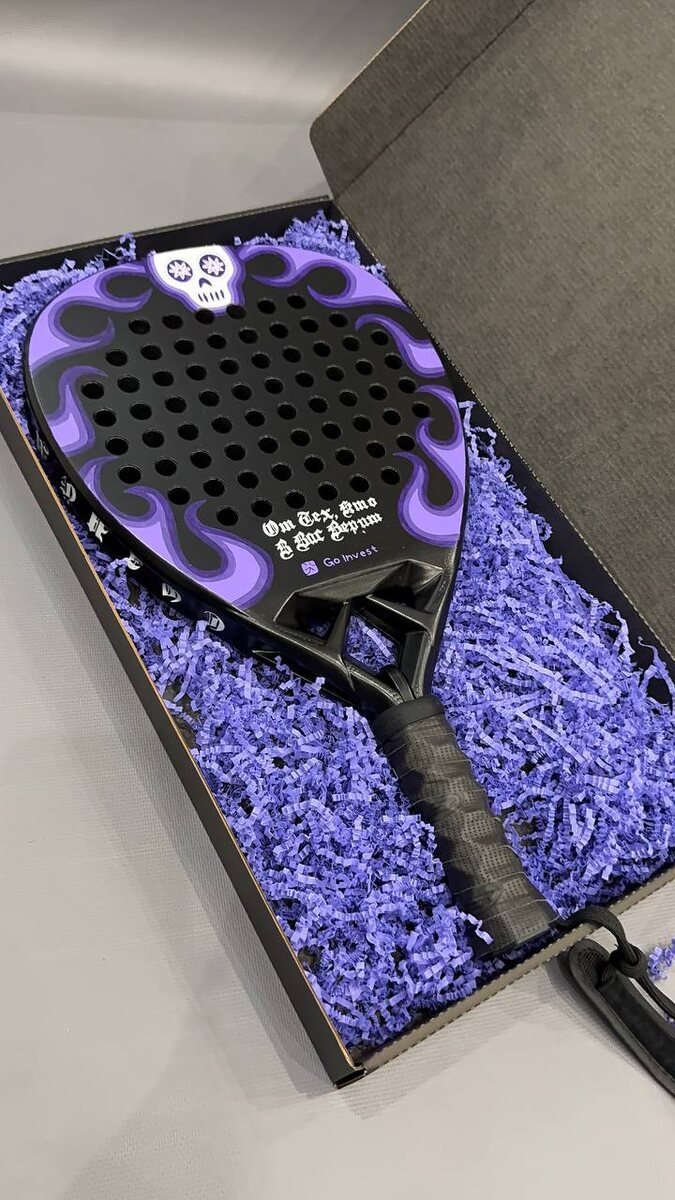Эксклюзивная роспись падел-ракетки в черно-сиренево-фиолетовых тонах с эффектным черепом и готическими надписями в центре дизайна. Кейс крафт также расписан вручную в едином стиле. По желанию можно добавить в покрытие специальную крошку для усиления сцепления и придания дополнительного вращения мячу (последнее фото)