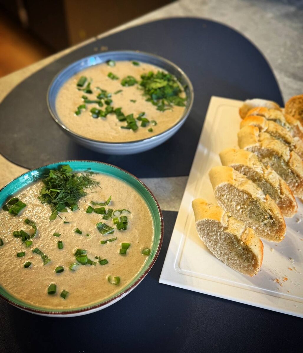 #идеяобед@zhizn_z 🔵Крем-суп из шампиньонов с зеленью 🔵Багет с чесноком