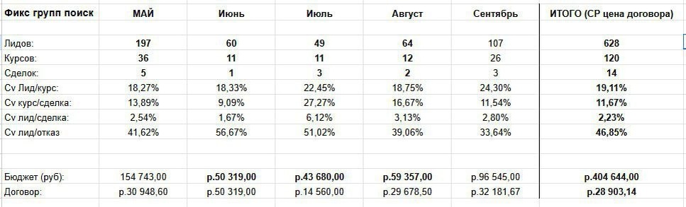 Итого: 628 лидов → 120 «курсов» → 14 договоров