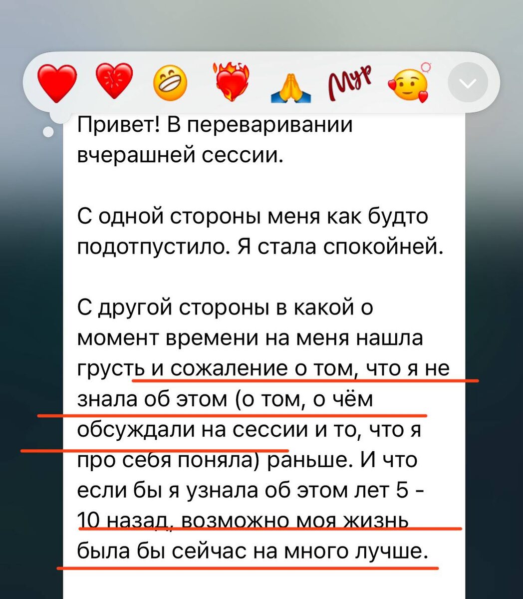 Цена отсрочки .. вот что по-настоящему дорого. После личных сессий на vip тарифе клиентка написала «Я так жалею, что не узнала этого 10 лет назад. Моя жизнь была бы лучше.» Еще никто не пожалел о деньгах, потраченных на флагман. И еще никто не порадовался, что "сэкономил" на нем. Зато почти все сожалеют, что не начали раньше. Это выкуп вашего времени, энергии, отношений, реализации, удовольствия, уверенности и нервной системы обратно. Покупка удочки вместо покупки рыбы.