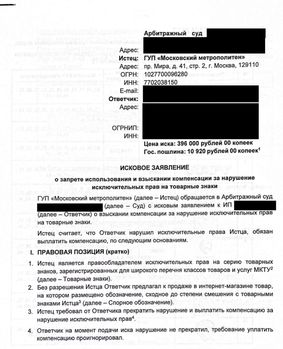 Таким образом, ГУП "Метрополитен" инициирует судебные процессы в случае обнаружения незаконного использования данных обозначений. Процедура выявления нарушений включает в себя приобретение продукции с использованием их товарных знаков непосредственно в Ваших торговых точках либо на маркетплэйсах путем скриншотов.