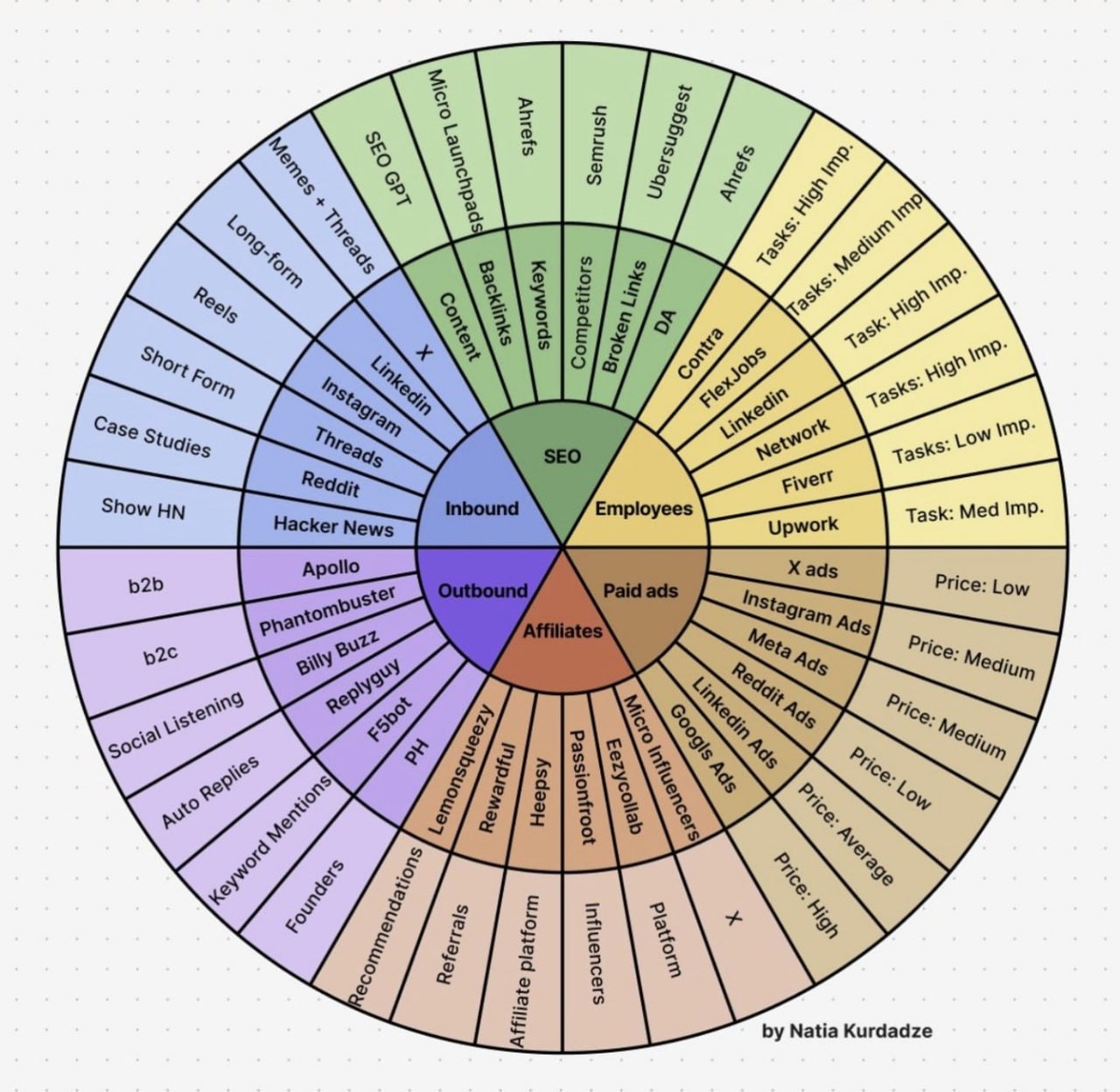 Колесо привлечения клиентов для стартапов Недавно в X наткнулся на классный фреймворк — Натия Курдадзе, опытный growth-маркетолог, разработала Колесо привлечения клиентов. Очень наглядная схема того, через какие каналы стартап может привлекать клиентов. Колесо делится на 6 блоков: 🟢 SEO — органический трафик и всё, что связано с контентом и ссылками. 🟢 Inbound — соцсети, комьюнити, форматы контента. 🟢 Outbound — холодные аутрич-инструменты. 🟢 Employees — сила личных контактов и активности команды. 🟢 Paid ads — платные каналы от X Ads до Google Ads. 🟢 Affiliates — партнёрки, рефералы, инфлюенсеры. Что мне нравится в этой модели: 🟢 Она помогает сразу увидеть ширину возможных каналов, а не зацикливаться на 1–2 источниках. 🟢 Видно, какие каналы дешёвые и быстрые, а какие требуют времени и бюджета. 🟢 Стартапам проще объяснять, куда они собираются вкладывать первые деньги на маркетинг и какие каналы тестировать. Обычно я скептически отношусь к универсальным схемам, но эта поле