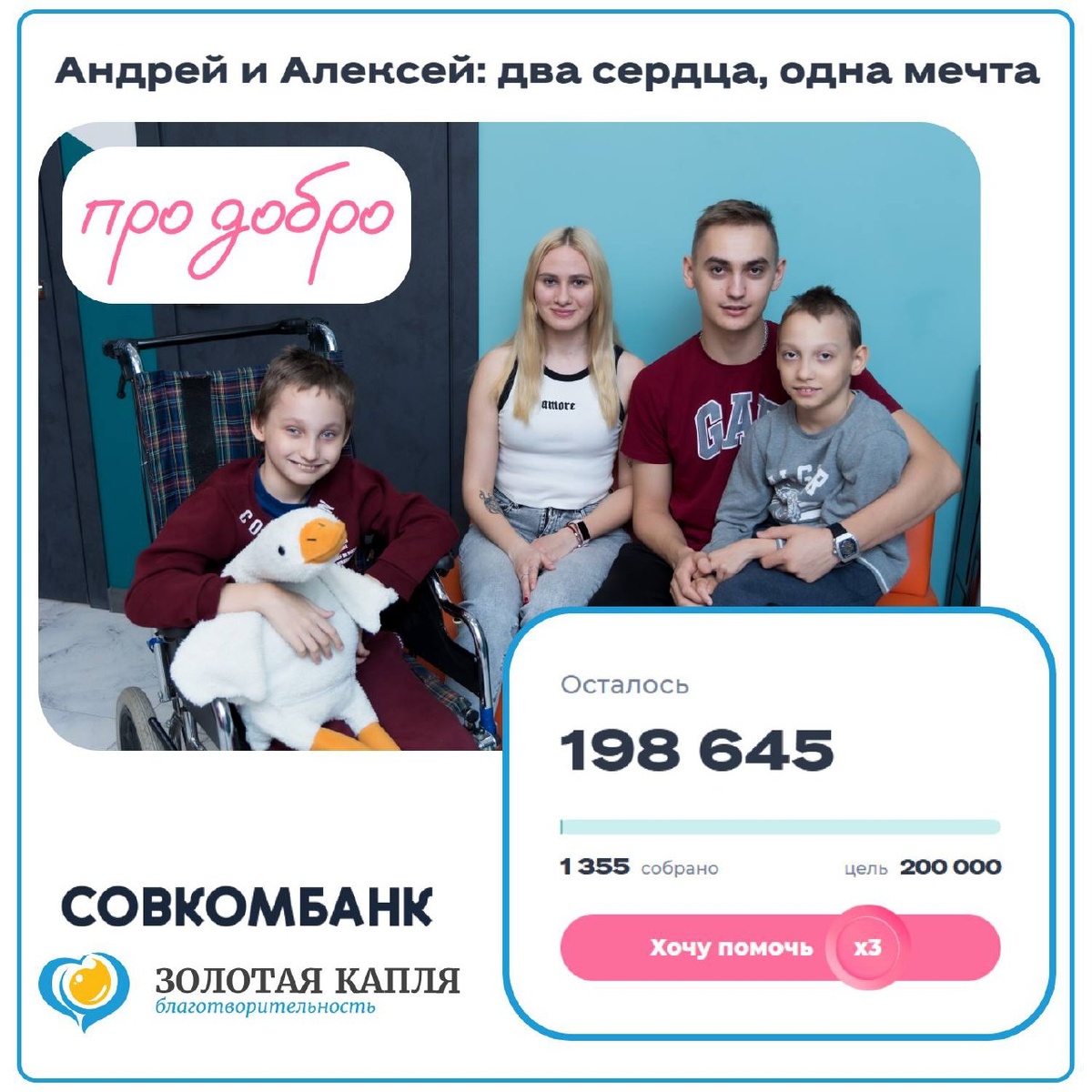 🙏Поможем братьям Лощилиным вместе. Друзья, у нас радостная и важная новость! Мы открыли новый сбор для Андрея и Алексея — 12-летних братьев-близнецов, которые с рождения борются с тяжелой формой ДЦП. Их история — это пример настоящей любви и мужества. После утраты родителей их старший брат Илья стал для них самым главным защитником. Для Ильи мальчики — смысл жизни, а их здоровье — главная цель. Любой может помочь! – Регистрируйтесь, получайте добробаллы за активность или покупки (если вы клиент Совкомбанка) и тратьте их на добрые дела. Совкомбанк умножает вашу помощь! ✨ – Ваши 600 ₽ + 1400 баллов (1 балл = 1 ₽) = 2000 ₽ на помощь Ване! – Не клиент банка? 450 ₽ + ваши первые добробаллы = 1000 ₽!