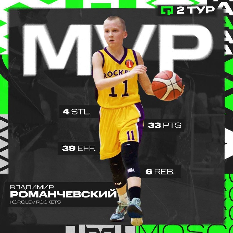 MVP Kids Романчевский Владимир (Korolev Rockets) vs БК "Лобня" 13-14, Квалификация, 2 тур 48:41 33 очка, 6 подборов, 4 перехвата, 39 эффективность Романчевский не почувствовал защиту "Лобни", доминируя на протяжении большей части встречи. В третьей четверти у Владимира был неудачный отрезок в матче, в остальном время его было просто не удержать. За первую половину в его активе было 21 очко при реализации 10 из 11 бросков с игры. Закончил встречу Романчевский с лучшими показателем эффективности в туре: 39 за 30 минут игры! 1️⃣@ABL Moscow