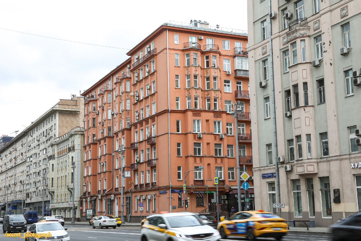 Сегодняшняя моя короткая заметка будет еще об одном доме, построенном специально для работников культуры, как и вчерашний архитектурный герой – ЖСК «50 лет МХАТ». И это… Его спроектировал и построил коллектив архитекторов: теоретик и практик конструктивизма, автор знаменитого дома Наркомфина Моисей Яковлевич Гинсбург и его чуть менее известные (по крайней мере в Москве) коллеги Федор Иванович Михайловский и Александр Васильевич Крестин. Интересно то, что хотя дом этот в некотором роде брат по отцу-архитектору «конструктивистского лайнера» на Новинском бульваре, внешне он больше напоминает жилой дом Народного комиссариата связи между проспектом Мира и улицей Гиляровского. Если помните, я показывал, что на нем тоже красуется такая же интересная живописная роспись по штукатурке. (7 фото) Еще таких «расписных» архитектурных громадин сталинской эпохи, к слову сказать, довольно много можно найти на Ленинградском проспекте, и пару из них я даже покажу в своих последующих заметках. (3 фото) Эт