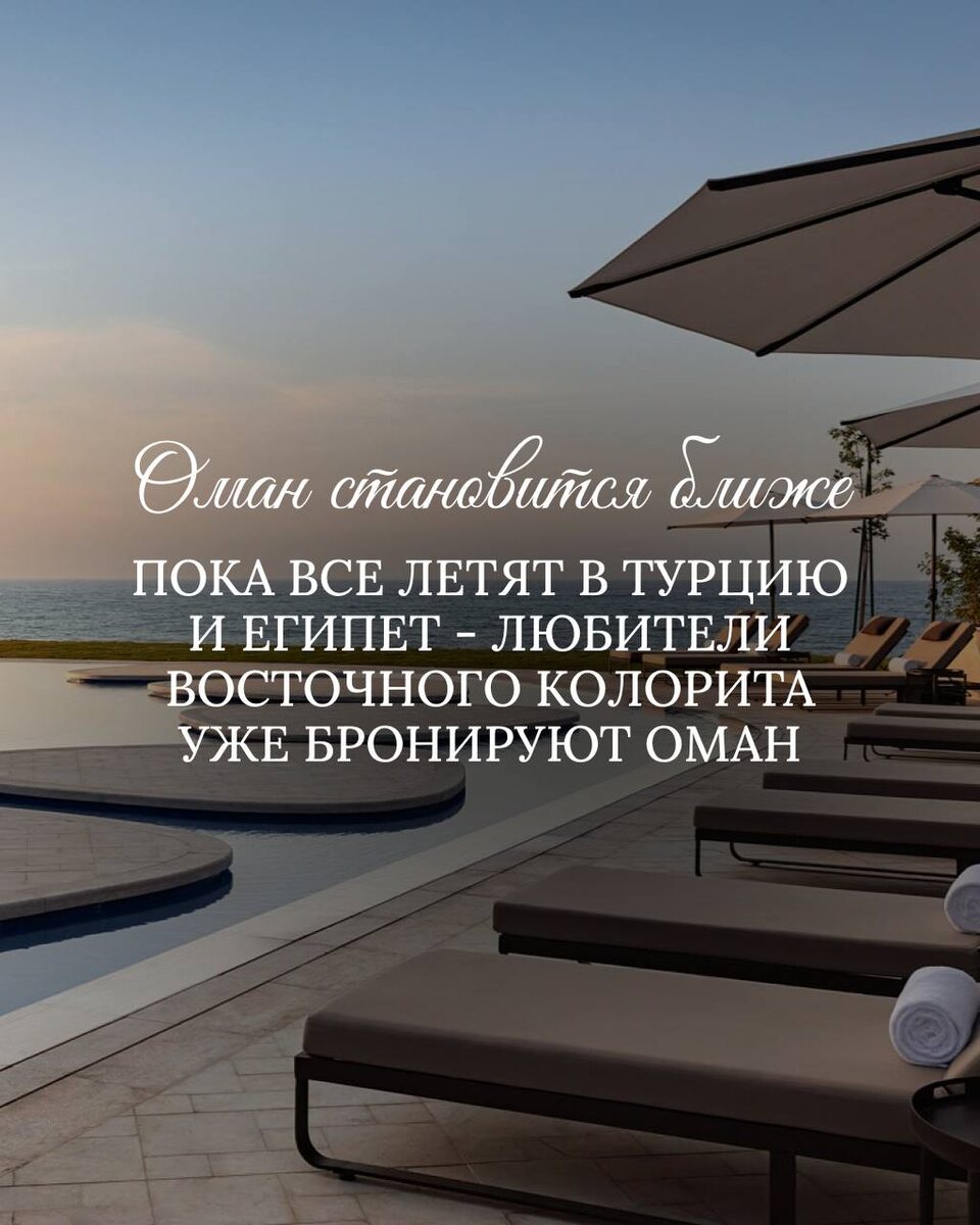Оман становится ближе: больше рейсов, больше возможностей Пока все летят в Турцию и Египет, любители восточного колорита уже бронируют Оман на осень. И вот почему это отличная идея. 📈 Турпоток в Оман этим летом вырос на 50% по сравнению с прошлым годом. Цифры не врут → направление набирает обороты, а значит, скоро станет мейнстримом. ☀️ С октября по март в Омане идеальная погода: никакой изнуряющей жары, температура комфортная и для пляжа, и для экскурсий. ✈️ Логистика тоже улучшается: ▪️ flydubai запускает блочную программу с 15 октября из четырёх городов России: Москва, Казань, Новосибирск, Екатеринбург ▪️ Oman Air увеличивает количество рейсов: в октябре 4 в неделю, в ноябре 5, с декабря ежедневно Так что это повод открыть для себя что-то непривычное и особенное) 🏨 Где остановиться: ✔️ The St. Regis Al Mouj Muscat → роскошь на побережье с видом на гольф-поле и пляж ✔️ The Chedi Muscat → член The Leading Hotels of The World, 21 акр территории, эстетика, собственный пляж ✔️ Sa