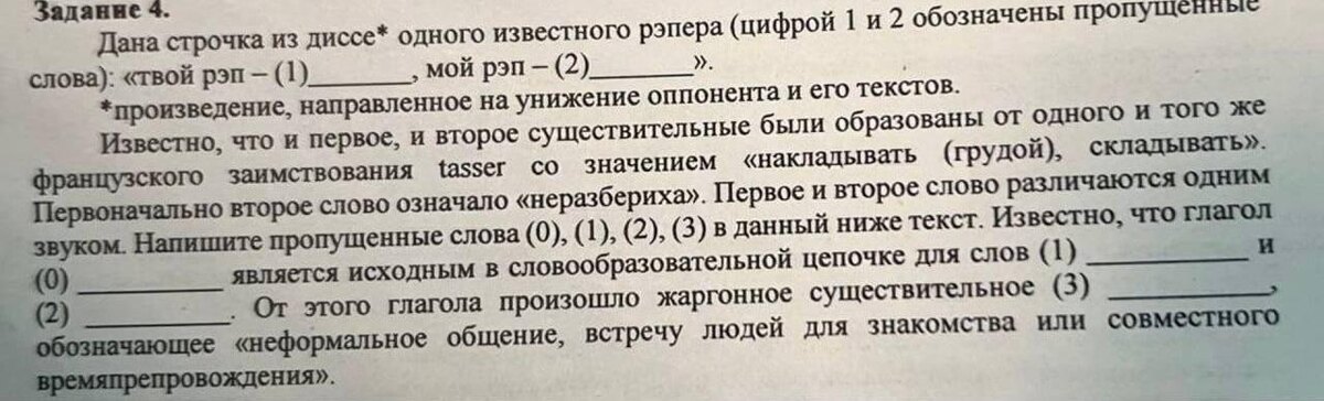 Оксимирон* в школьной олимпиаде: рэп как литературный прием В Сочи школьникам решили устроить не только проверку по русскому, но и рэп-эксперимент: в заданиях школьного этапа всероссийской олимпиады этапа 11-классники дополняли строчки из песен Оксимирона* и указывали жаргонное существительное. В мэрии поспешили уточнить, что это вовсе не попытка прокачать подростковую субкультуру, а аккуратный анализ этимологии и современных словообразовательных процессов. Рэп, по версии администрации, в данном случае — всего лишь современная форма словесного искусства. * Власти считают иноагентом. https://bg.ru/bg/people/people-news/29992-olimpiadi-po-russkomu ❤️ «Большой Город»