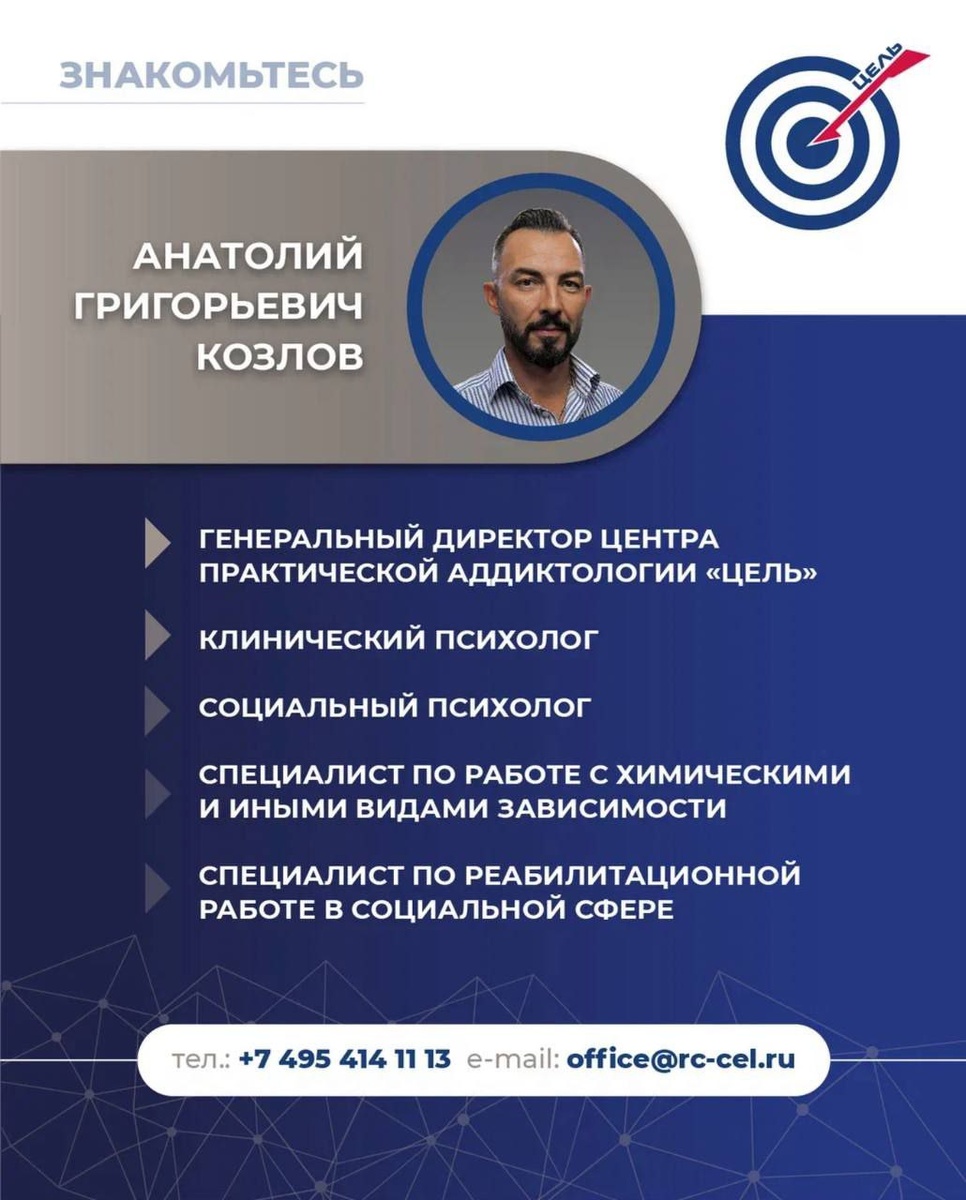 Дорогие подписчики, мы очень хотим познакомить вас с нашим коллективом. С радостью представляем вам нашего Генерального Директора — Анатолия Григорьевича Козлова - человека, который стоит у руля нашего центра и направляет его к успеху и процветанию. Анатолий Григорьевич — эксперт в области реабилитации и психического здоровья с более чем 10 лет опыта работы в данной сфере, имеет ряд дипломов и сертификатов, подтверждающих его квалификацию, а также получает множество благодарностей и грамот за достижения в области реабилитации и поддержки зависимых. Его страсть к помощи людям, столкнувшимся с трудностями, вдохновляет как команду специалистов, так и тех, кто решает изменить свою жизнь. Анатолий Григорьевич активно участвует в конференциях по зависимостям, делится опытом и знаниями, стремясь повысить осведомленность о проблемах зависимостей. Под его руководством наш центр стал местом, где забота, понимание и профессионализм идут рука об руку. Мы рады, что можем работать с таким тал