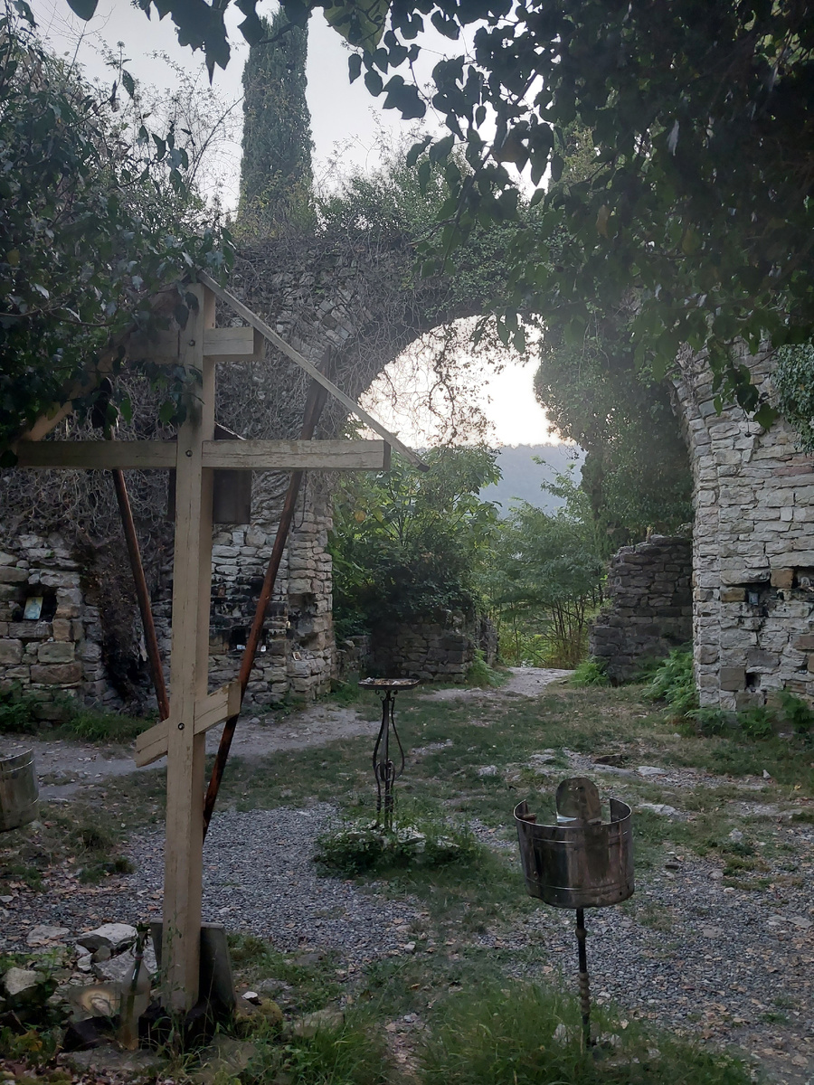 Ахштырский храм расположен в окрестностях одноимённого села в Адлерском районе Сочи. По сведениям археологов, храм был построен византийцами в период с X по XIII век на Псеашхинском ответвлении Шелкового пути, проходившем в долине реки Мзымта. Сейчас от храма остались две арки, разрушенные стены и очертания алтаря. Однако здесь продолжаются службы — священники и прихожане посещают храм. Удивительно, как спустя столько лет на месте сохранились стены и кладка. И это при том, что здесь неровная поверхность, и земля как бы "играет" с годами. В стенах мы увидели различные иконы, но не все из них были православными. Также на кладке был замечен воск от свечей. Вероятно, во время службы здесь ставят свечи возле икон. Однако одна из стен немного обгорела, что заметно по почерневшей кладке. Эта локация достаточно безлюдна, вероятно, потому что немногие знают об этом месте. По информации на сентябрь 2025 года, руины храма планируют очистить от деревьев, кустарников и зарослей, обработать