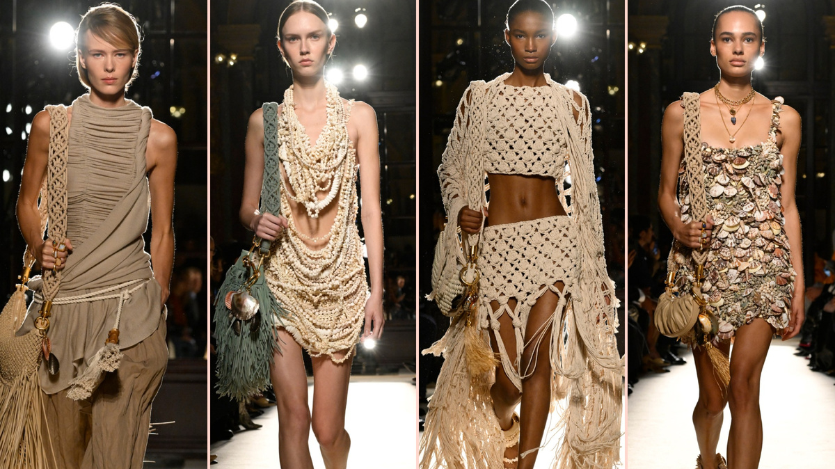 Оказывается, вирусное платье Balmain, в котором Тайла появилась на прошлогоднем Met Gala, было лишь верхушкой песочного замка. Оливье Рустен посвятил всю свою весеннюю коллекцию Balmain морскому побережью: платье без бретелек, напоминающее обернутое вокруг туловища полотенце после купания, ансамбли из макраме с длинной бахромой и ракушки, звенящие на одежде, обуви и сумках. Он также повторил свой песочный дизайн для милых бюстгальтеров и топов, что символизирует его погружение в более обтекаемую, доступную моду для знаменитого дома, отмечающего в этом году свое 80-летие. Это был более непринужденный Balmain, основанный на широких брюках-саруэл и парашютах, свитерах, сползающих с плеч, жакетов из кожи или грубого хлопка и драпированных топах из джерси. Вместо платьев с плотной вышивкой он соорудил топы, напоминающие бюстгальтеры, и кокетливые платья из нитей ракушек и деревянных бусин, а кульминацией стало жесткое бюстье, напоминающее аметист, растущий из тела. Руст