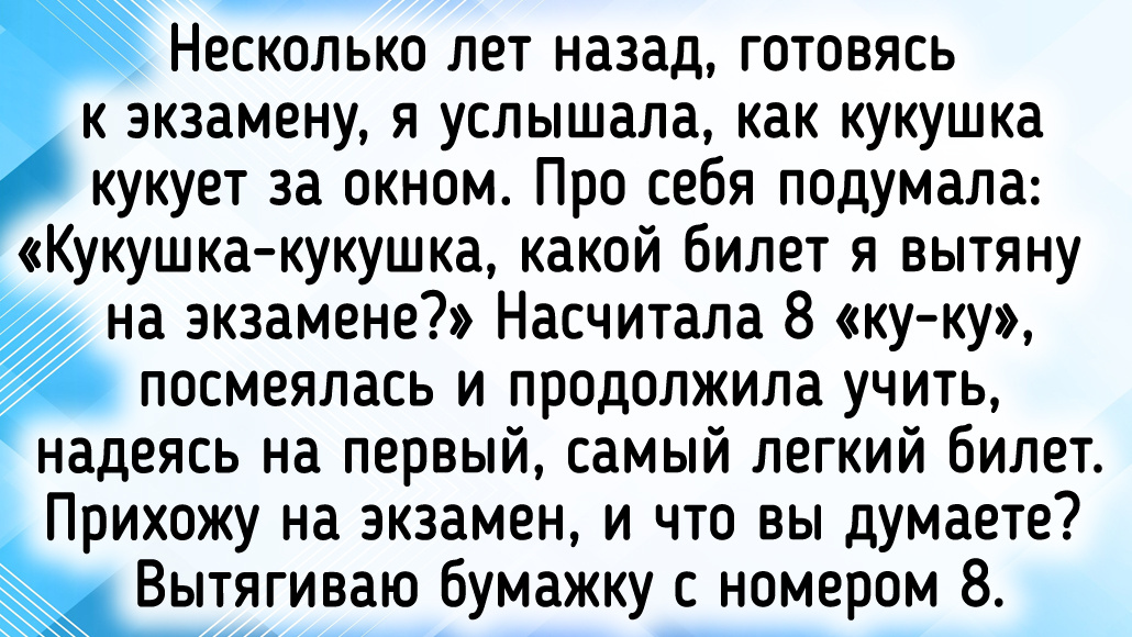 - Несколько лет назад, готовясь к экзамену, я услышала, как кукушка кукует за окном. Про себя подумала: «Кукушка-кукушка, какой билет я вытяну на экзамене?» Насчитала 8 «ку-ку», посмеялась и продолжила учить, надеясь на первый, самый легкий билет. Прихожу на экзамен, и что вы думаете? Вытягиваю бумажку с номером 8.