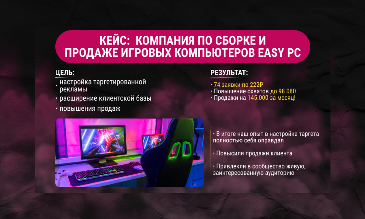 Всем привет! Меня зовут Галина Тимакина – я маркетолог и основатель рекламного агентства Timakina Marketing. Для продвижения сообществ компаний в ВК мы в 99% случаев используем таргетированную рекламу. На данной площадке — это самый эффективный инструмент, проверенный сотнями клиентов. Моя команда имеет огромный опыт в настройке таргета, поэтому для нас не существует ниши, в которой мы бы не смогли принести результата. Этот кейс тому доказательство. К нам обратилась компания по сборке и продаже игровых компьютеров Easy PC из Санкт-Петербурга с запросом на продвижение их товаров и услуг в ВК. Мы настроили таргетированную рекламу и в течение месяца ее вели, в результате клиент получил не просто заявки, а реальные продажи на 145.000 рублей. Рассказываю, как мы построили алгоритм работы. Наш клиент — компания Easy PC. Она занимается продажей ПК «под ключ». На компьютере уже все установлено — драйвера и лицензионная Windows, необходимые программы и игры. Сама компания расположена в Санкт-Пе
