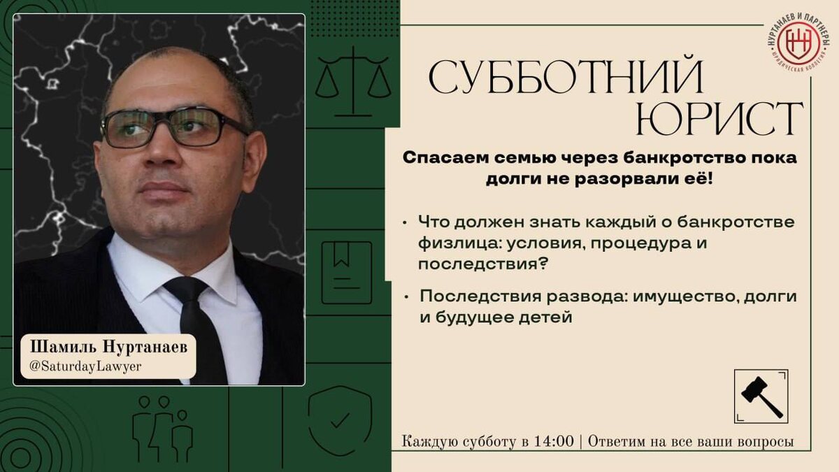 ⚡️⚡️⚡️⚡️Спасаем семью через банкротство пока долги не разорвали её! - 2 ЧАСТЬ Во второй части эфира мы разберём ключевые юридические последствия развода: раздел имущества и долгов, вопросы опеки и алиментов, а также то, как минимизировать негативные последствия для семьи. ⚖️ Эфир проведет юрист с более, чем 20 летней практикой – Шамиль Нуртанаев (нажав на имя вы можете узнать о юристе больше). Тема эфира: «Семья и Банкротство» 📝 Вот основные вопросы, которые мы обсудим в эфире: 1. Что должен знать каждый о банкротстве физлица: условия, процедура и последствия? 2. Последствия развода: имущество, долги и будущее детей Также, каждый может задать свой вопрос любым удобным для вас способом, перейдя по ссылке: https://clck.ru/3ByDxh Или же просто напишите вопрос в комментариях к посту Получите юридическую консультацию, не выходя из дома! 🎥 Записи эфиров на нашем Rutube: https://rutube.ru/channel/40148985/ VK Видео: https://vk.com/video/@vk.nurtanaev Дзен: https://clck.ru/3DQGpA ⚡