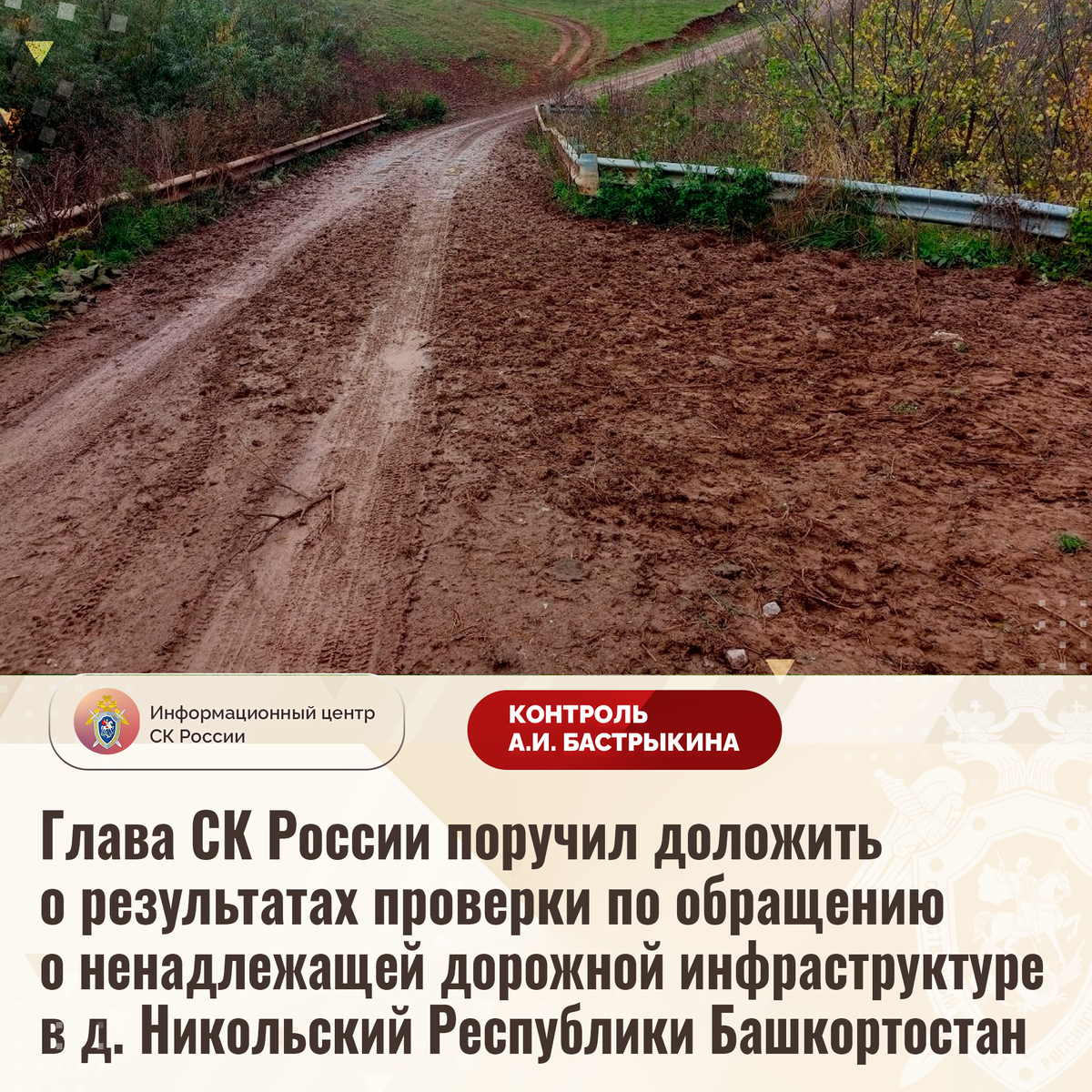 Глава СК России поручил доложить о результатах проверки по обращению о ненадлежащей дорожной инфраструктуре в д. Никольский Республики Башкортостан В приёмную Председателя СК России А.И. Бастрыкина «ВКонтакте» поступило обращение по вопросу нарушения прав жителей деревни Никольский города Бирска Республики Башкортостан на качественную дорожную инфраструктуру. Автомобильный мост и единственная дорога, соединяющие несколько улиц в населенном пункте, находятся в непригодном состоянии: асфальтовое покрытие отсутствует, грунтовые полотна при выпадении осадков и таянии снега регулярно размываются. В результате проезд автомобилей, в том числе спецтранспорта, к домовладениям граждан затруднен. Местные жители опасаются разрушения моста. Многочисленные обращения в компетентные органы результатов не принесли. В СУ СК России по Республике Башкортостан организована процессуальная проверка. Председатель Следственного комитета Российской Федерации Александр Иванович Бастрыкин поручил руководителю СУ
