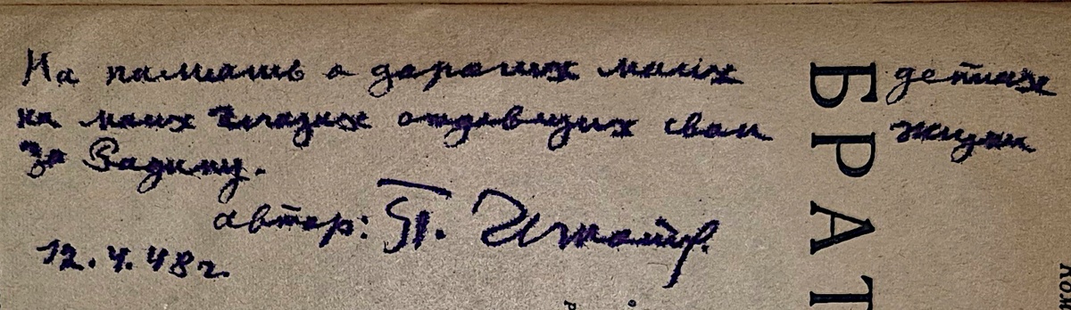 На пожелтевшем от времени титульном листе строгого издания серии «Военная библиотека школьника» фиолетовыми, слегка расползающимися чернилами, округлым уверенным почерком выполнена дарственная запись: «На память о дорогих моих детях, на моих глазах отдавших свои жизни за Родину. Автор: П. Игнатов. 12.4.1948 г.».