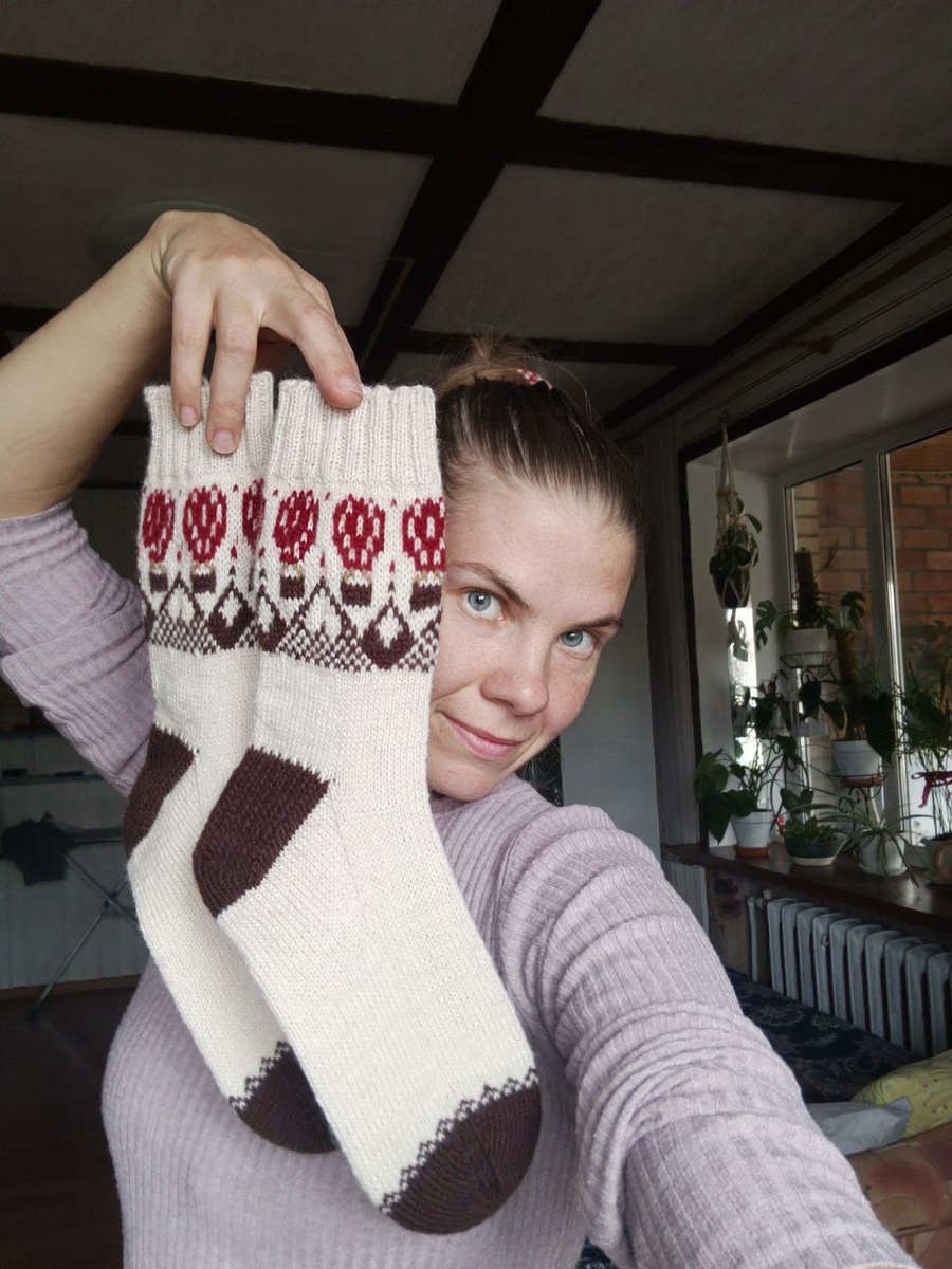 Готовы носочки "Шары над горами" Вес после стирки 68гр. Пряжа Forza Solid: бежевый 4603, коричневый 4623, красный 4646. Спицы #2 на резинку и #2,5 на жаккард. Резинка и лицевая гладь на 68 петель. Для блока жаккарда прибавить 4 петли - 72 петли, после жаккарда эти 4 петли убавить. Пятка подкова укрепленная.