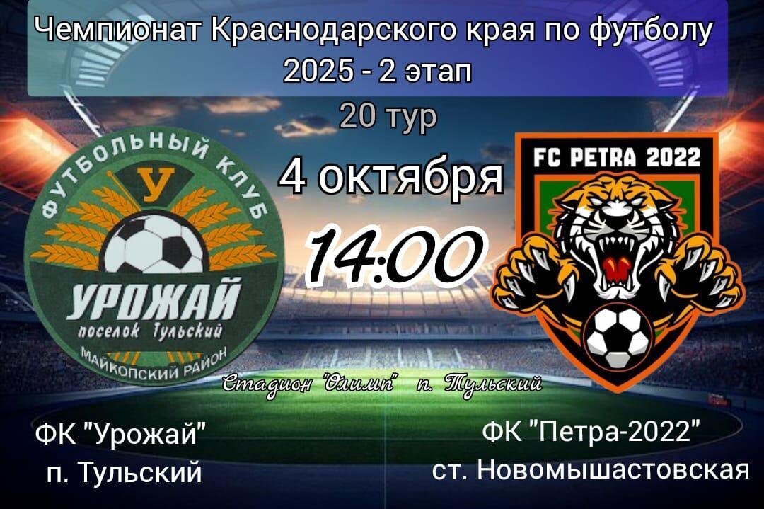 ⚽4 октября в 14:00 в рамках 20-го тура пройдет матч между ФК «Урожай» из поселка Тульского и ФК «Петра-2022» из станицы Новомышастовской