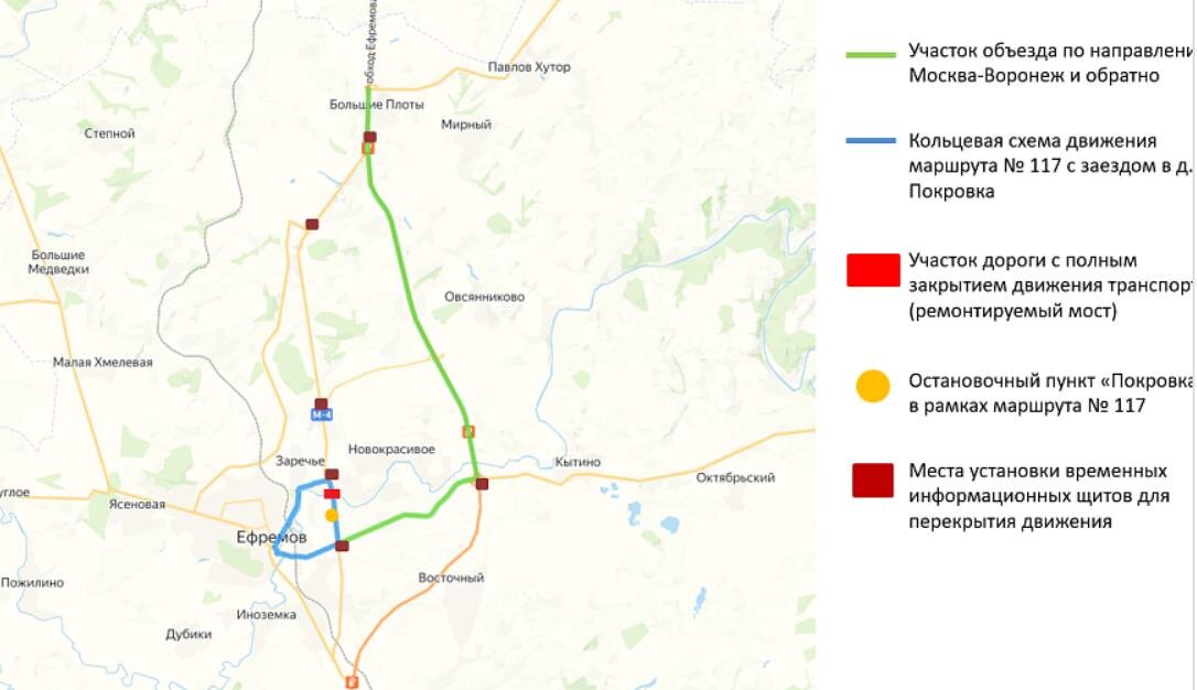 Объездной маршрут будет организован по трассе М-4 «Дон» (основное направление, платный участок) и участку автомобильной дороги Рязань — Ряжск — Александр Невский — Данков — Ефремов.