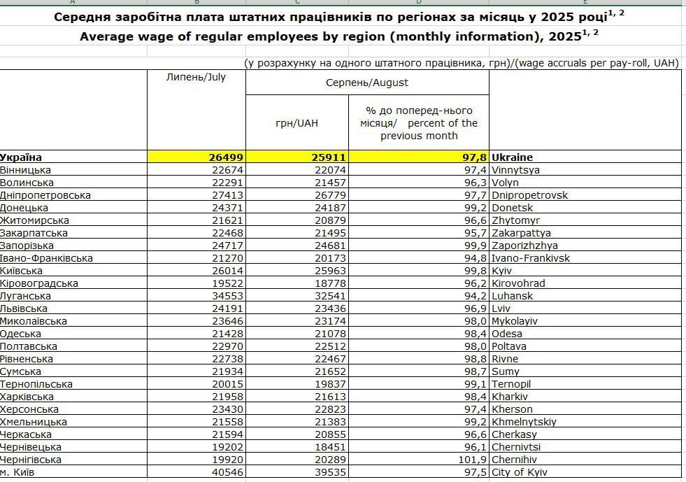 Заработная плата сократилась почти по всей стране. Согласно официальным данным, опубликованным Государственной службой статистики, в августе 2025 года в Украине зафиксировано снижение среднемесячных доходов работающих граждан. По сравнению с июльскими показателями средняя заработная плата по стране уменьшилась на 2,2% — с 26 499 гривен до 25 911 гривен. В столице зарплаты снизились на 2,5%, упав с 40 546 до 39 535 гривен. Одесская область оказалась в общем тренде — здесь доходы сократились на 1,6%, составив 21 078 гривен против июльских 21 528 гривен.