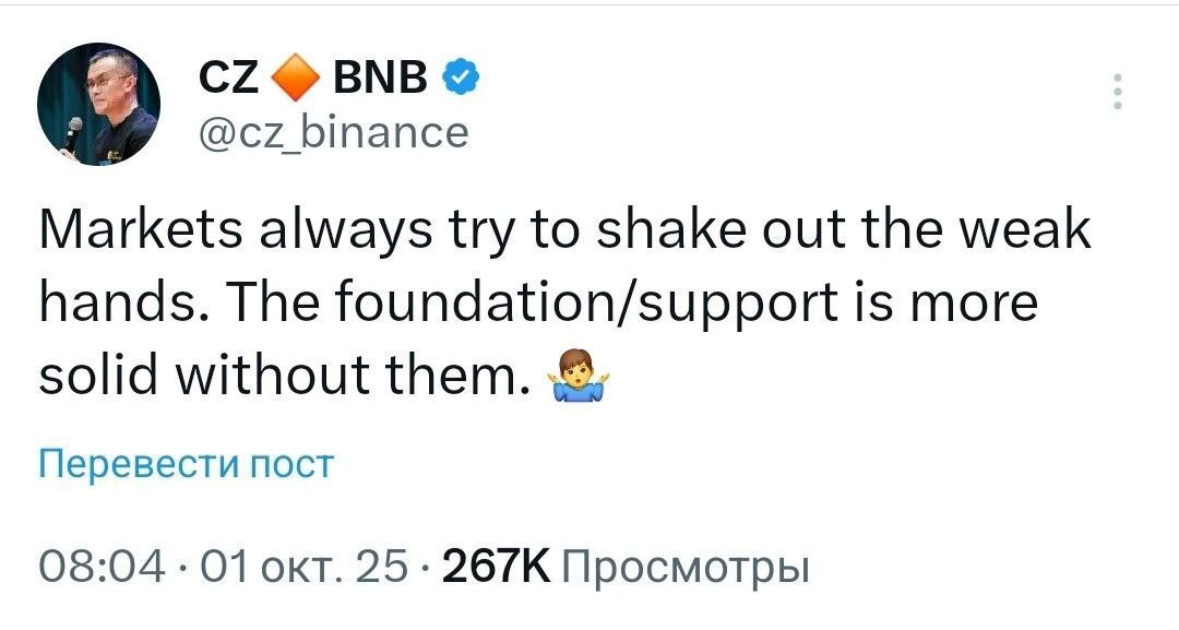 📈 Bitcoin поднялся выше $116 000 впервые с 19 сентября — CZ опять напоминает, чтобы вы не стали лошарой дали себя вытряхнуть при тряске. Мое мнение: Сегодня рынок зелёный, неделю назад всё было красным, и мало кто хотел покупать. По факту именно тогда был лучший момент для покупки.