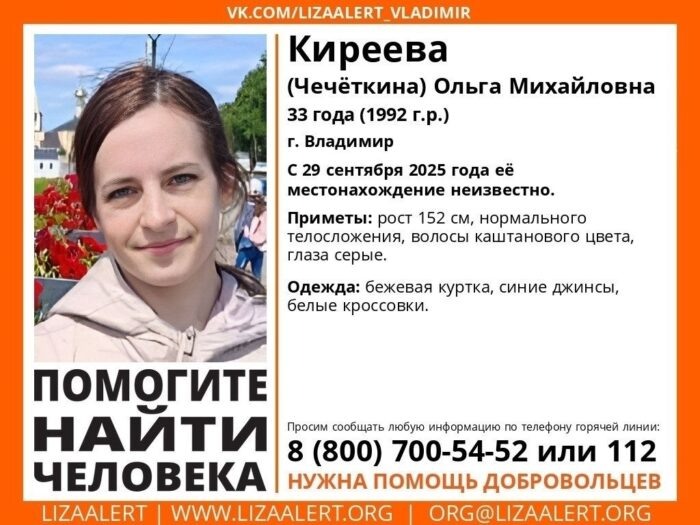 Поисковый отряд «ЛизаАлерт» ведет поиски 33-летней женщины, которая пропала во Владимире. Её зовут Ольга Михайловна Киреева, в девичестве Чечёткина. Женщина ушла из дома 29 сентября и не вернулась. С тех пор место её нахождения неизвестно. Когда Ольга перестала выходить на связь, родственники забили тревогу и обратились за помощью в поисково-спасательный отряд. Фото: «ЛизаАлерт» Потерявшаяся женщина была одета в бежевую куртку и синие джинсы, на ногах – белые кроссовки. Ольга Киреева невысокого роста – 152 сантиметра, нормального телосложения, волосы каштанового цвета, глаза серые. Любую информацию о девушке можно сообщить в «ЛизаАлерт» по телефону горячей линии: 8 (800) 700-54-52 или 112. Инфорг: Чип (Александра) 8 (903) 648-85-75. Поисковому отряду нужны добровольцы в каждом районе области. Им может стать любой человек вне зависимости от места жительства. Помимо выездов на поиски, помогать можно из дома. Например, прозванивать лечебные учреждения или распространять ориентировки. «Отр
