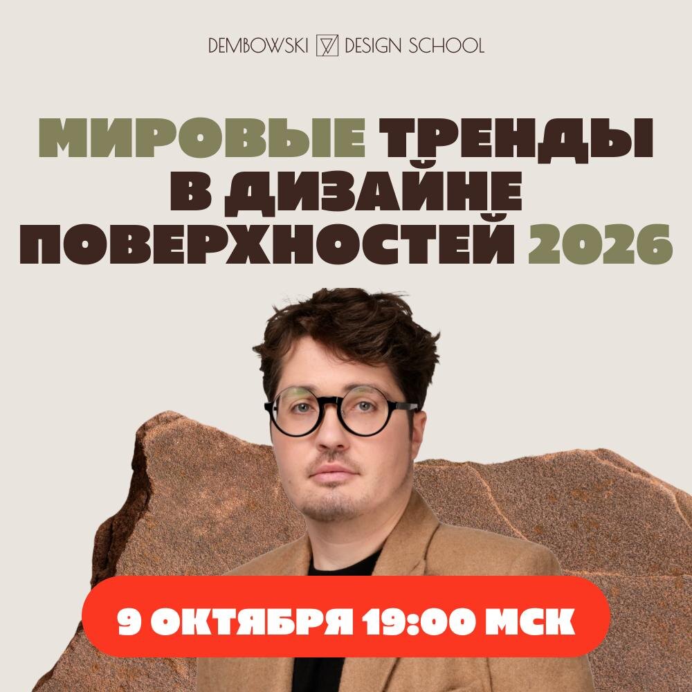 Виктор Дембовский о трендах дизайна на 2026 год. 9 октября в 19:00 состоится онлайн-лекция Виктора Дембовского о том, как текстуры и покрытия превращаются из «отделки» в самостоятельный художественный прием. Сегодня именно они формируют характер интерьера и задают атмосферу — и в ближайшие годы их роль станет еще заметнее. Что вас ждет на лекции?