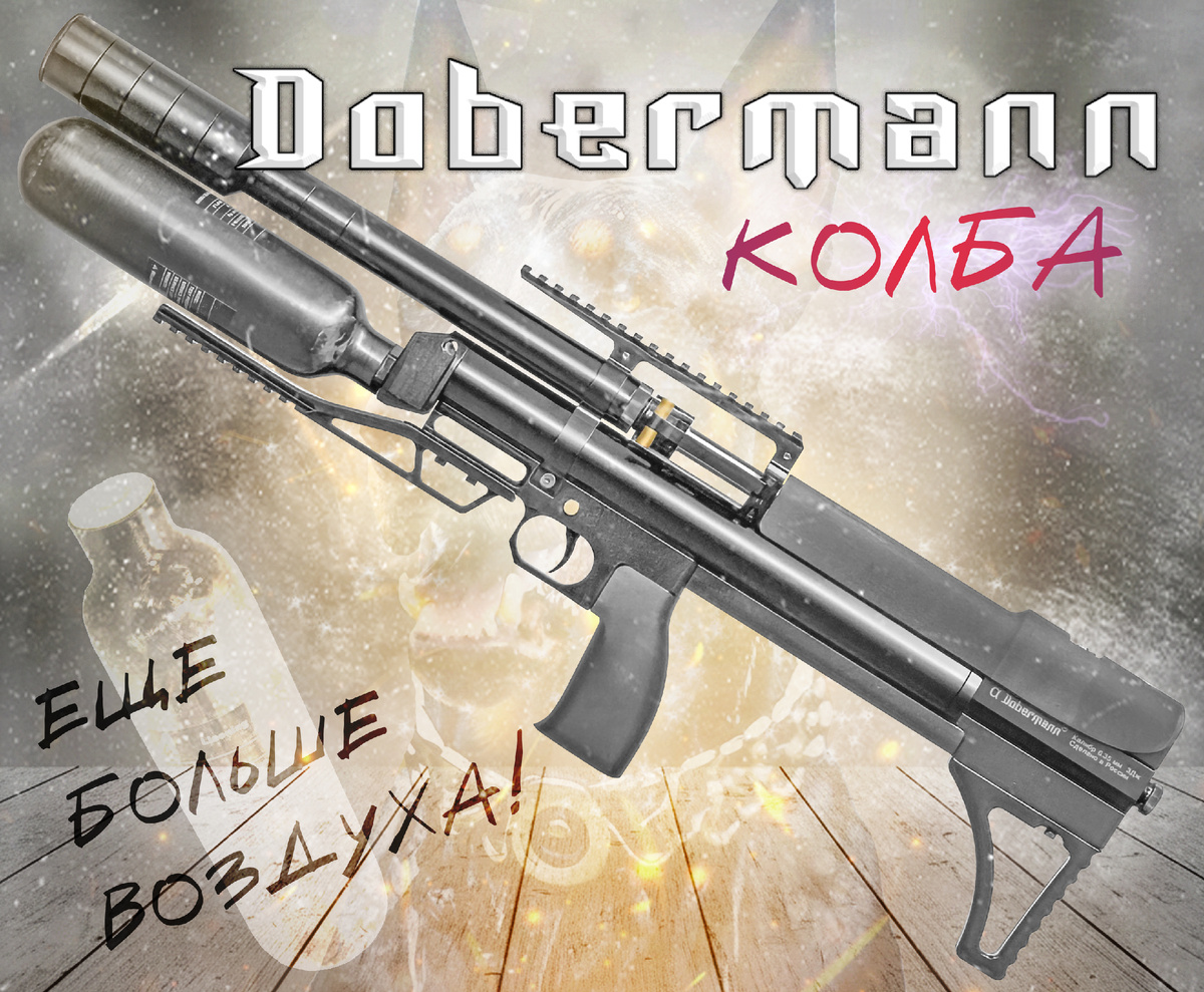 Рассматриваемая Dobermann пневматическая винтовка отличилась от классического исполнения расширением резервуарной части с помощью установки колбы. Таким решением изготовитель удовлетворил требования тех, кто хотел иметь винтовку с повышенным запасом воздуха. Фирма предоставила возможность выбирать колбовую PCP пневматику в различных калибрах и длинах ствола - с частью подобных моделей можно ознакомиться по ссылкам ниже:
