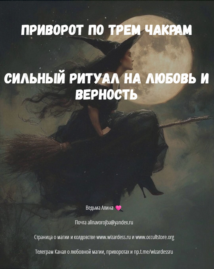 Это магическое воздействие на три ключевых энергетических центра: Считается, что одновременное влияние на все три центра создает особенно сильный и устойчивый эффект. Проведение ритуала Вам понадобится: Порядок действий: Действие ритуала может проявиться в течение недели. Помните, что любое воздействие на волю другого человека имеет свои последствия, и подходить к таким практикам нужно с особой ответственностью. Ведьма Алина ( https://t.me/wizardessru) И моя Почта alinavorojba@yandex.ru