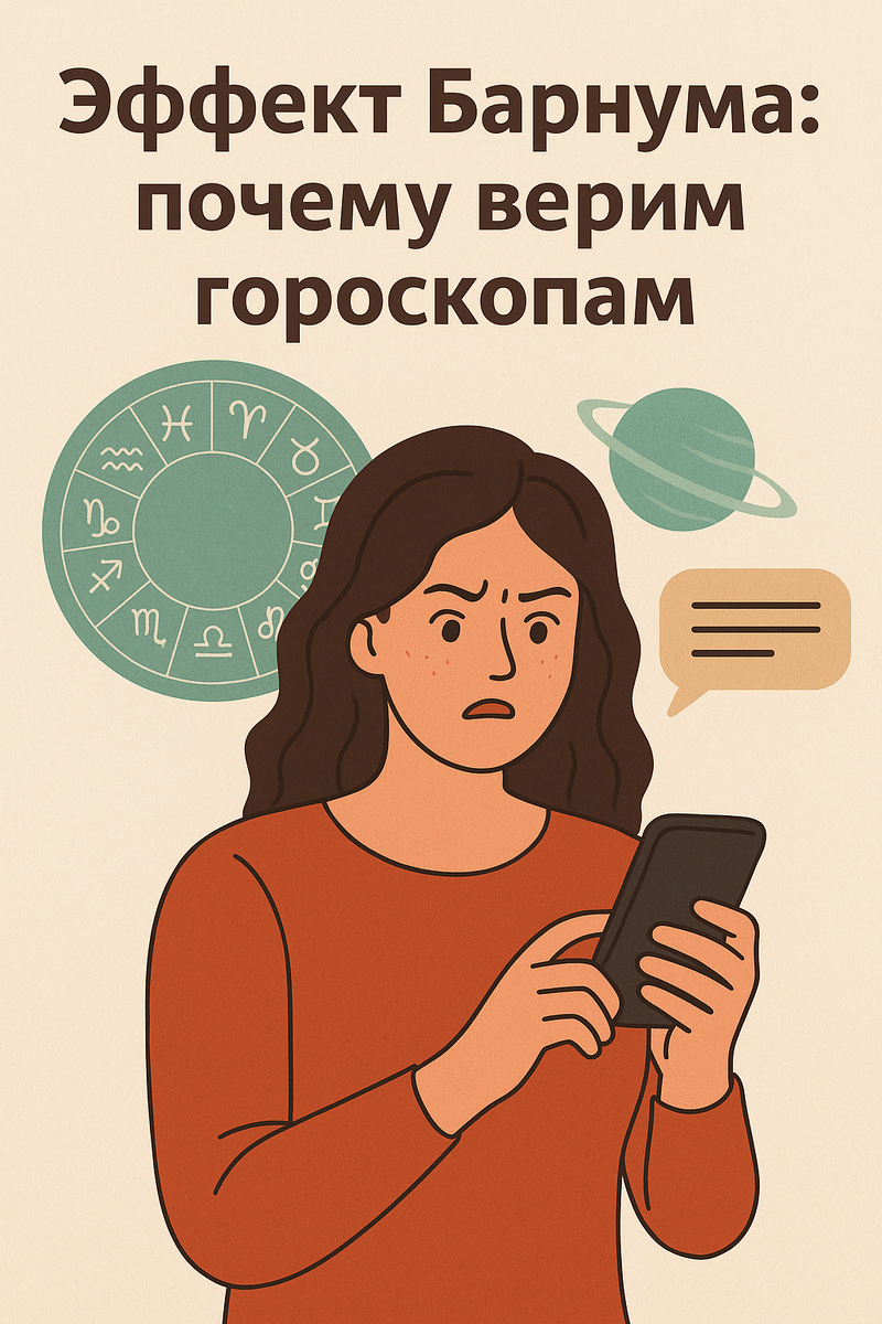 Вы когда-нибудь ловили себя на мысли: открываете гороскоп и с удивлением замечаете — «это же прямо про меня»? Кажется, будто звёзды видят все наши тайны. Но на самом деле дело не в звёздах, а в психологии. Существует феномен, который объясняет эту магию совпадений, — эффект Барнума. Эффект Барнума (или эффект Форера) — это психологическая иллюзия, когда человек воспринимает обобщённые, размытые описания как точные и индивидуальные. В 1948 году психолог Бертрам Форер провёл знаменитый эксперимент: Фокус в том, что всем достался один и тот же текст. Анна открывает гороскоп: «Сегодня вас ждёт успех в работе, но возможны недопонимания с коллегами».