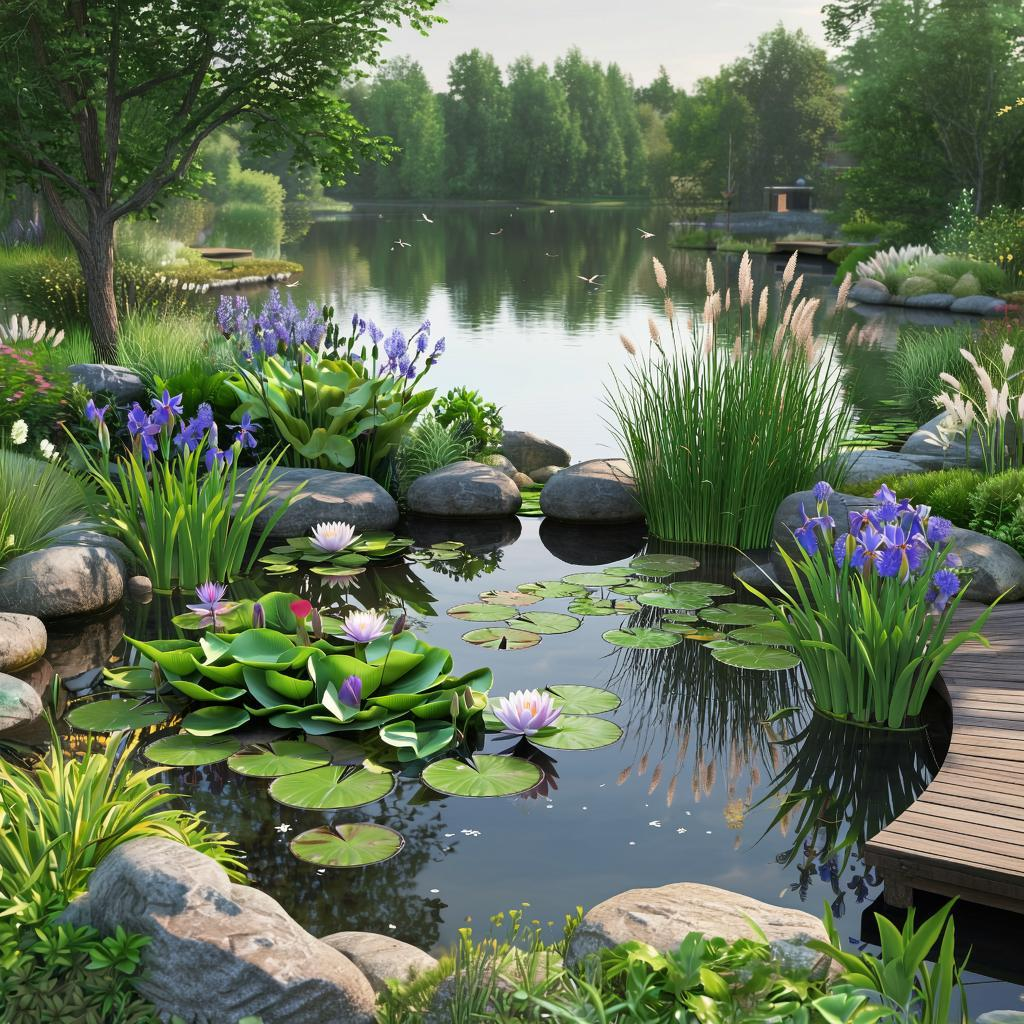 Декоративный водоем становится настоящим украшением участка, создавая атмосферу умиротворения и спокойствия. Отражая небо и окружающие растения, водная гладь создает неповторимый природный ландшафт, который преображает даже самый обычный участок. Водные растения играют важную роль в оформлении пруда и поддержании экосистемы: Оптимальное расположение пруда – в полутени, где он не будет сильно прогреваться. Это помогает избежать цветения воды и поддерживает её прозрачность. Даже на небольшом участке можно создать компактный водоем, который станет любимым местом отдыха. Дизайн пруда может включать: Пруд может выполнять различные роли: Правильно обустроенный пруд не только украшает участок, но и становится центром притяжения для всей семьи, местом для отдыха и созерцания природной красоты. При этом даже небольшой водоем способен преобразить пространство и создать особую атмосферу гармонии с природой.