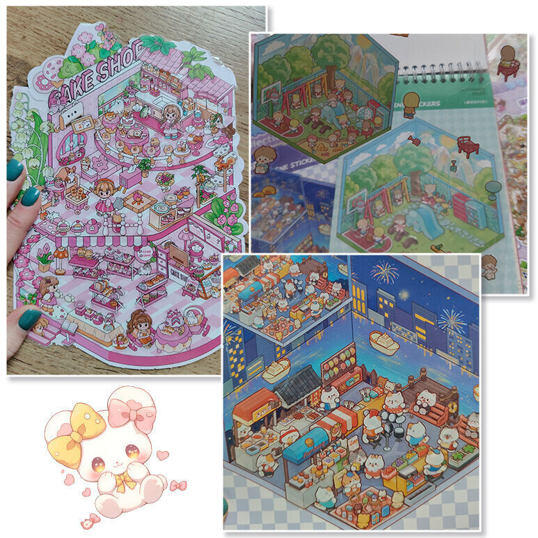 Наверняка вы слышали слово «румбокс» — с английского roombox можно перевести как «комната в миниатюре». Многие мои подруги и коллеги занимаются таким хобби: собирают замки Хогвартс и прибрежные кафе. На монтаж одной локации может уходить до нескольких месяцев: надо сверяться с инструкциями, собирать мини-мебель, клеить обои, иногда даже проводить подсветку. Увлекательный процесс, но не для меня. В качестве хобби я искала что-то проще и быстрее. И нашла. Румбокс, который можно собрать за пару часов, потому что это альбом с наклейками. Обычно это блокнот с несколькими локациями. На плотном картоне уже нарисован фон миниатюры: небо, пейзаж, площадка. На прозрачных листах — маленькие наклейки с персонажами, предметами, мебелью, животными, растениями и т. п. Прилагается картинка, по которой вы собираете сюжет бокса, по сути, клеите наклейки. В наборе есть пинцет. Во-первых, я люблю комиксы и анимацию, смотрела в детстве и «Союзмультфильм», и аниме, и «Дисней», и «Пиксар». Сейчас устраиваю п