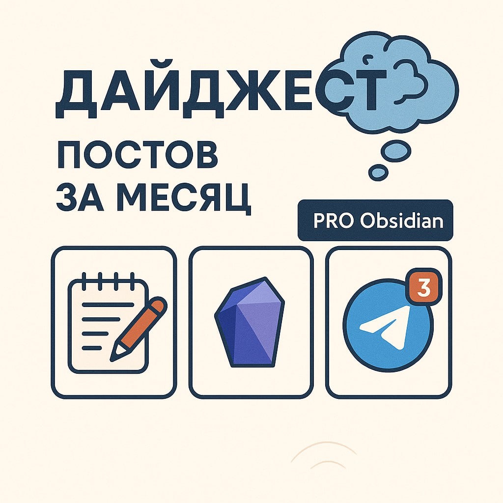 🗒 Дайджест новостей за сентябрь 2025 ================================ 🤩 CSS-сниппеты *⃣Скрываем показ свойств для отдельной заметки с помощью CSS-класса *⃣Визуально подсвечиваем текущий день в календаре ⚙ Новые (и проверенные) плагины *⃣Agile Board - Матрица Эйзенхауера, канбан, который совместим с Dataview и Tasks, и еще куча полезностей для управления задачами *⃣Journals - замена покрывшихся пылью Calendar и Periodic Notes. Множественные журналы (можно создавать наборы для одного периода - например для ежедневных быстрых заметок и дневника) со своими шаблонами, правилами именования, и с возможностью выбора по клику на дате в календаре *⃣Notebook Navigator. Альтернативный (в рамках Obsidian) взгляд на то, как может выглядеть навигация по файлам. Поклонники интерфейсов Evernote и Apple Notes точно будут довольны *⃣Zotero Reader. Все понятно из названия - читаем источники из библиотеки Zotero прямо внутри Obsidian. Тут же их и аннотируем *⃣Подборка AI-плагинов для Obsidian 🖌 Оф