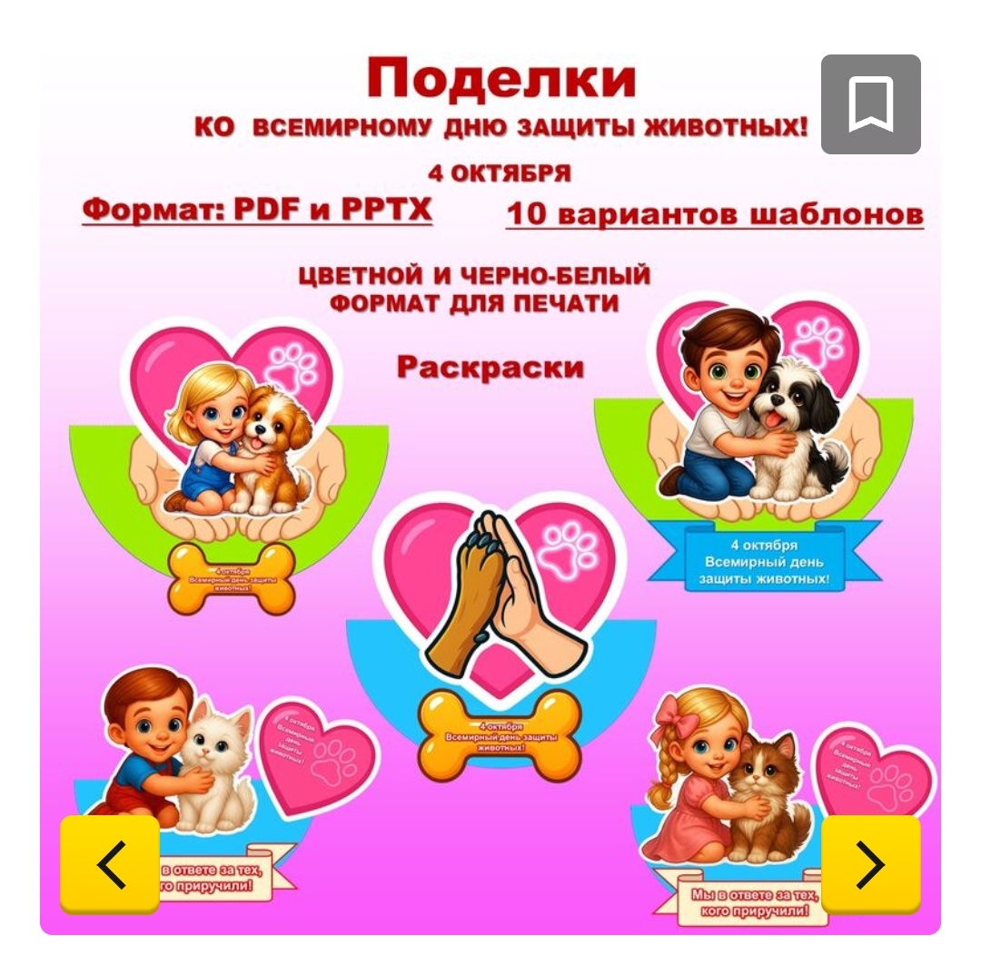 Аппликация (поделка) ко Всемирному дню защиты животных, 4 октября. Всемирный день защиты животных ежегодно отмечается 4 октября и направлен на привлечение внимания к важности заботы о наших меньших братьях. Предлагаемый комплект включает десять вариантов шаблонов. 1. Шаблоны поделки в чёрно-белом варианте. Черно-белый вариант можно распечатать, вырезать и наклеить на цветной картон или цветную бумагу. Также можно раскрасить шаблоны самостоятельно с помощью красок, цветных карандашей и фломастеров. 2. Шаблоны поделки в цветном варианте. Цветной вариант поделки легко распечатать, вырезать и собрать с помощью клея. Это позволяет использовать материал как для оформления, так и для творческой деятельности на классном часе, внеклассном мероприятии или занятии в детском саду. Поделка-аппликация ко Дню защиты животных 4 октября. "День защиты животных" 4 октября. Цветные шаблоны упрощают процесс создания поделки: Вырезание элементов: • Аккуратно вырежьте все детали строго по обозначенному