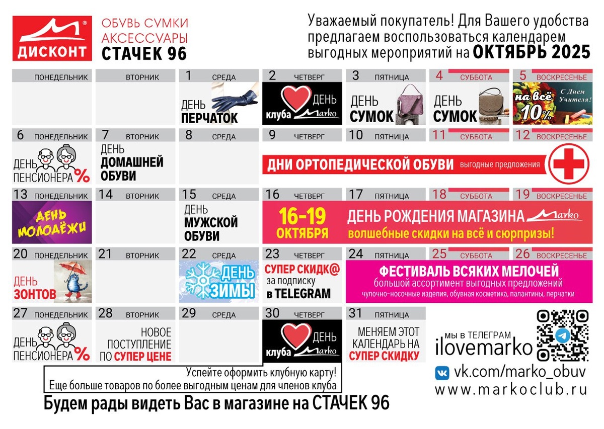 Уважаемые покупатели! Для Вашего удобства предлагаем воспользоваться календарем выгодных мероприятий на ОКТЯБРЬ, которые будут проходить в магазине МАРКО ОБУВЬ по адресу СТАЧЕК 96! Свой персональный экземпляр календаря Вы можете получить в магазине на Стачек 96! Удачных и выгодных Вам покупок!