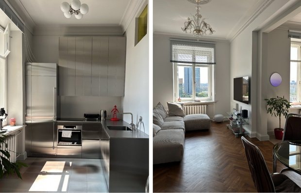 В квартире были отреставрированы оригинальные окна, двери и паркет, сохранившие атмосферу прошлого. Пространство дополнено винтажными элементами, такими как стильная мебель и светильники.