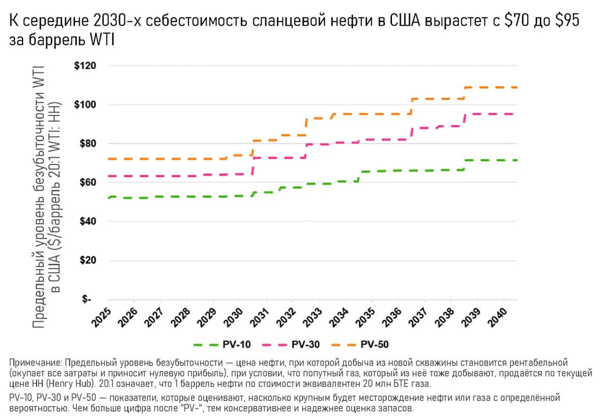 Сланцевая революция в тупике Американцы с воодушевлением рассказывали миру о своей "сланцевой революции": дескать, США теперь полностью контролируют рынок, нефти навалом, а конкуренты пусть нервничают. Но цифры говорят обратное. По данным Enverus, себестоимость добычи сланцевой нефти в США будет расти: с текущих $70 за баррель до $95 к середине 2030-х. Лучшие и самые дешёвые месторождения уже выкачаны, дальше остаются сложные и дорогие залежи в менее изученных районах. Бассейн Пермиан в Северной Америке и канадские пески ещё будут держать рынок, но общая картина ясна: если в прошлые десять лет США и Канада обеспечивали весь прирост мировой добычи, то в следующем десятилетии их вклад упадёт вдвое. Ранее мы уже писали о скором достижении пика в сланцевой добыче нефти в США, и данные Enverus это подтверждают: бурить новые скважины станет совсем невыгодно. Что это значит для России? Пока американцы будут душиться собственными издержками, у Москвы открывается окно возможностей. На ази
