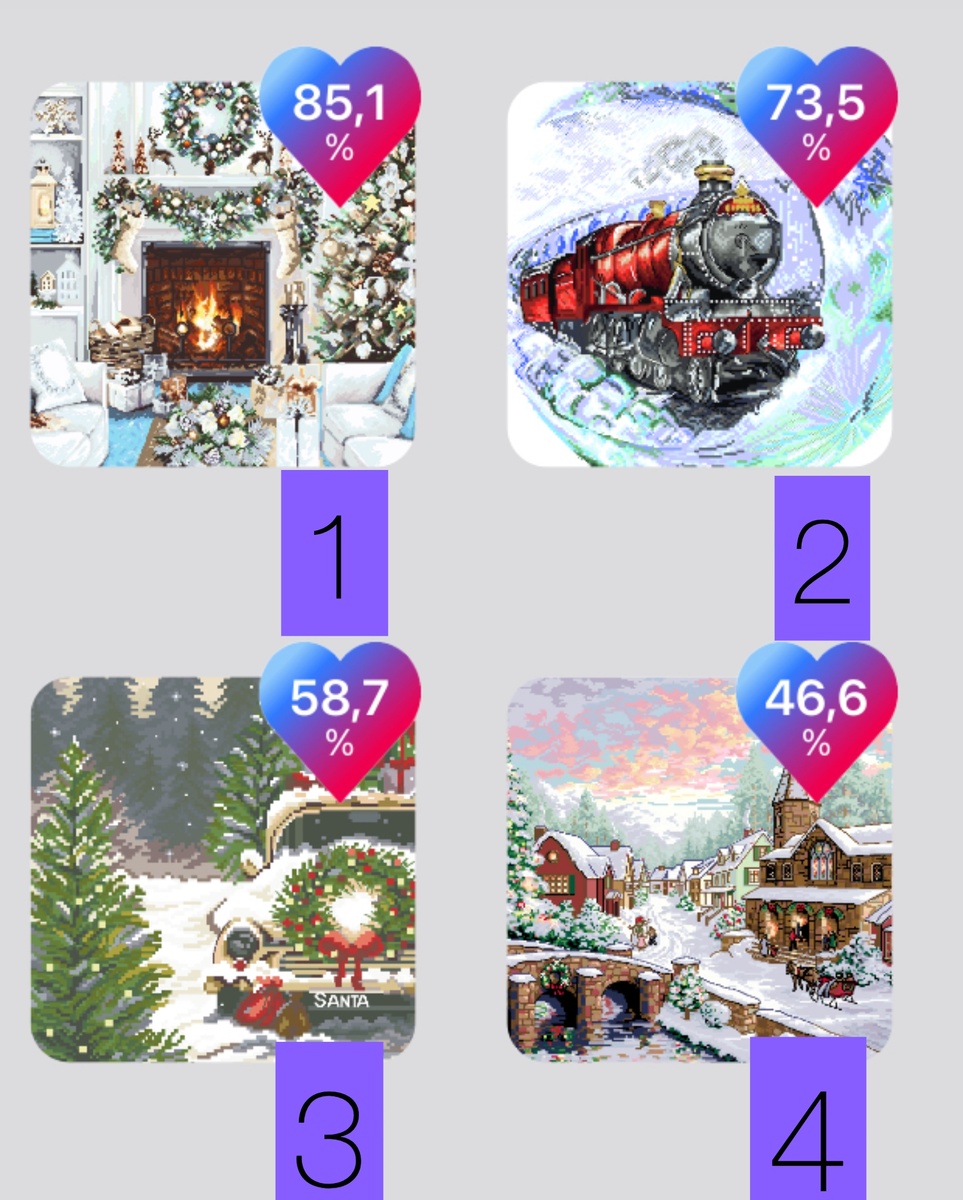 Всем привет) Наступила среда, а это значит, что вы снова можете повлиять на то, что я буду вышивать на выходных. 🛑стоп🛑 в комментариях объявлю в пятницу. На этой неделе игроки неизменны: 1- «Рождественский интерьер» от Luca’s 2- «Лунный поезд» от Андрианы 3- «Новогодняя машина» от Панны 4- «Рождественская деревенька» от Dimensions Выбор за вами 💙