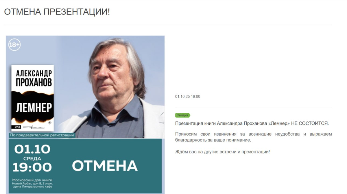 Сегодня должна была состояться презентация романа "Лемнер" Александра Проханова в Московском Доме Книги. Но в последний момент МДК отменил мероприятие. Сославшись на какой-то "экстремизм". Потому ли, что в главном герое романа угадывается тень Евгения Пригожина? Это нелепо и глупо. Александр Андреевич - безусловный государственник и патриот. А сложные моменты истории нужно не замалчивать, а проживать и осмыслять. Чему и способствуют книги великих писателей. Как-бы-чего-не-вышлы из МДК чего-то в нашей культуре и в нашей политике явно не понимают.