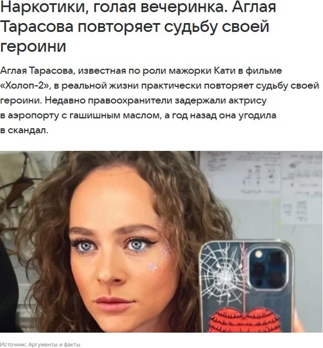 28 августа в аэропорту Домодедово таможня остановила Аглаю Тарасову после прилёта из Тель-Авива. В её багаже нашли вейп-девайс с тёмной жидкостью; экспертиза показала ~0,4 г гашишного масла (каннабис-экстракт). Возбуждено дело по статье о контрабанде наркотиков — санкции по этой норме предусматривают до 3–7 лет лишения свободы.