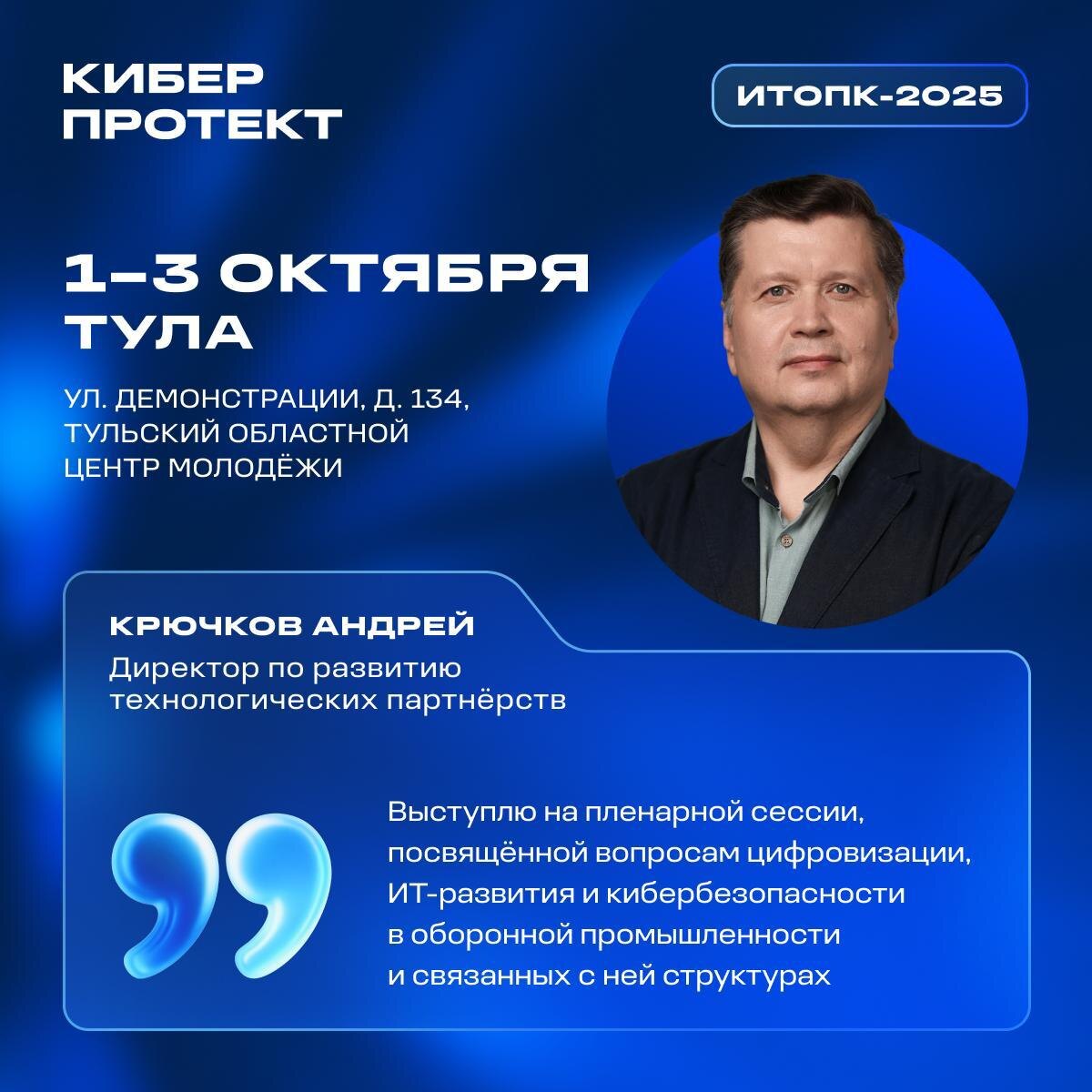 Киберпротект на ИТОПК-2025 В эти дни в Туле проходит ИТОПК, крупнейший форум по цифровизации оборонно-промышленного комплекса России! Киберпротект традиционно принимает активное участие в этом масштабном событии: на форуме работает целая команда наших опытных экспертов и докладчиков. В карточках рассказываем подробнее о темах выступлений. Если вы планируете посетить Форум, будем ждать вас на нашем стенде (№ 10.4) возле сцены на 1-м этаже!