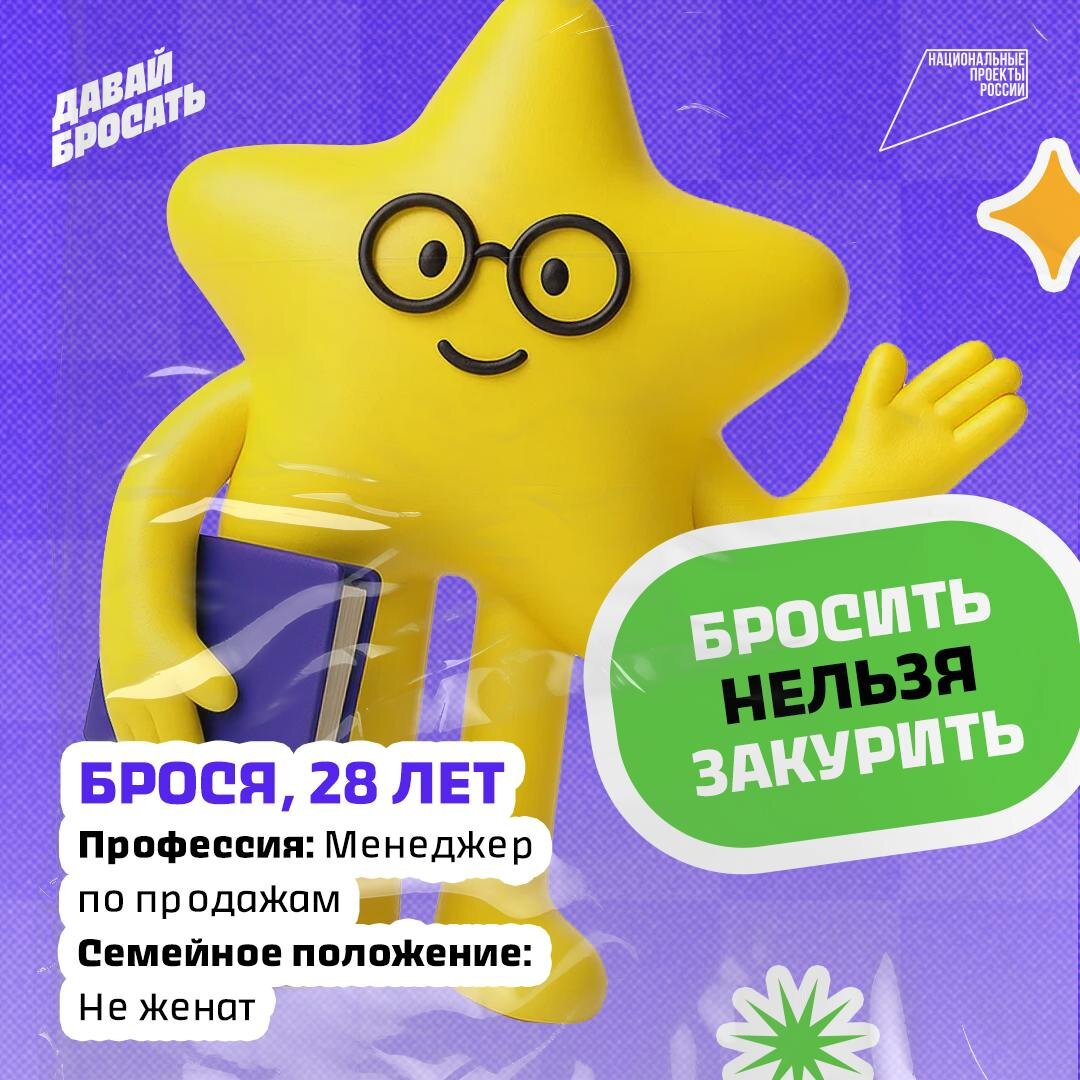 Новый месяц, а значит — новый интенсив 🌟 В этот раз в ваши руки попадёт судьба одного бросающего, который ну очень хочет завязать с никотином, но совсем не знает, как. В формате простой игры вы будете определять действия Броси. Всё, что знаем о нём, показали на картинке 👆 А что произойдёт с ним в ближайшие две недели — зависит от вас! Может быть, вы поможете ему отказаться от зависимости. А может, разрешите сорваться разок-другой? 🎲 И первый выбор предстоит сделать уже сейчас: только что Брося железно решил бросить. Что делать — не курить с этого момента или выкурить все сигареты и сделать последнюю затяжку вейпа, а начать завтра? Ставь реакцию, если советуешь: 👍 — бросить прямо сейчас 👀 — покурить от души напоследок #факт_дня