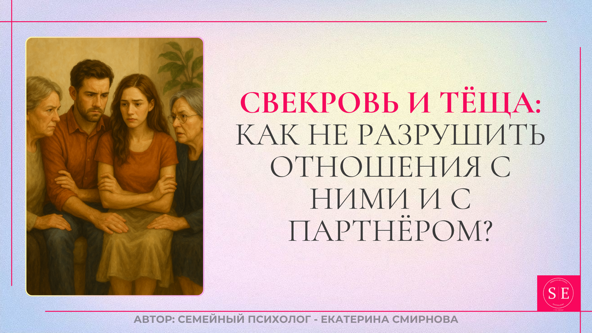 Автор: Екатерина Смирнова — семейный психолог, эмоционально-фокусированный терапевт, опыт с 2017 года «Она вечно лезет в нашу жизнь», «А твоя мама опять сказала, что я плохая хозяйка», «Я между двух огней — мамой и женой». Конфликты с родителями партнёра — одна из самых частых тем в семейной терапии. Особенно, когда речь идёт о свекрови или тёще. Сегодня разберёмся, почему эти отношения бывают напряжёнными, как выстроить границы и сохранить при этом тёплый контакт — и с родителями, и с партнёром. Для многих мам взросление ребёнка и его новый союз воспринимается как угроза. Внутренне они могут чувствовать: «Я больше не на первом месте» — и включаются в борьбу за влияние. Как вести быт, как воспитывать детей, как отдыхать — у каждой семьи свои нормы. И когда сталкиваются два мира — появляются конфликты. Если партнёр не обозначает, где заканчивается влияние родителей, свекровь или тёща могут начать вмешиваться в жизнь семьи — «из лучших побуждений». Иногда родители просто не умеют отпуска