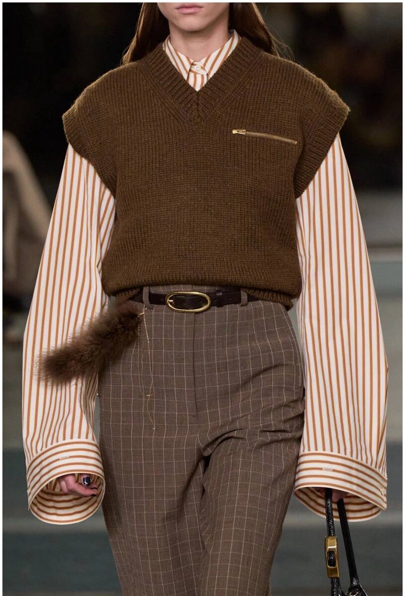 Обсудим этот лук. Здесь мы видим вайб Раисы Прокофьевны. И ощущение, с одной стороны, консервативности за счет плотных тканей, приглушенного оттенка, классической клетки, полоски. Но в то же время опытные глаза подметят, что это игра в строгость, игра в консервативность. Именно оверсайз объемные рукава, именно меховой хвостик, именно сочетание всего осеннего и темного превращает этот образ из скучного в интересный, в иронию. Кто из вас чувствует, что уже понимает идею этого образа? И понимает, что смог бы повторить? И какую обувь надели бы?