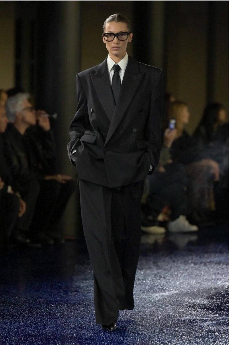 Новости с Парижской недели моды. Белла Хадид является постоянной музой креативного директора Saint Laurent Энтони Ваккарелло. Весна-Лето 2026: На показе весенней коллекции 2026 года Белла появилась в платье ярко-оранжевого цвета с блестящим, похожим на ветровку, покрытием. Образ был дополнен массивными плечиками, чулками и классическими лодочками. Осень-Зима 2025: Ранее, на показе осенней коллекции 2025 года, она демонстрировала кружевное платье королевского синего цвета, выдержанное в той же ретро-силуэте с подчеркнутой линией плеч.