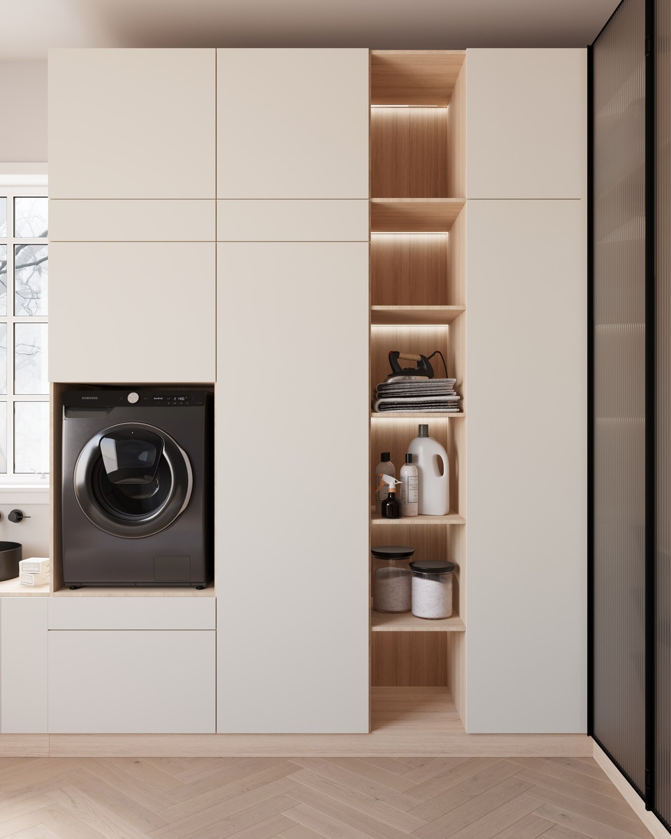 Один шкаф заменяет целую комнату: Это решение позволяет держать всё под рукой и не загромождать пространство. Особенно востребована такая встроенная постирочная зона в компактных помещениях, где каждый сантиметр имеет значение. Теперь даже небольшая квартира