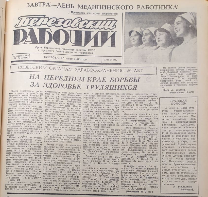 16 июня 1968 года двойной праздник отмечали медики: День медицинского работника и 50-летие советского здравоохранения. Коллективы поликлиник, больниц, аптек, санэпидстанций, детских яслей и санактивисты подводили итоги своей работы и вырабатывали задачи на будущее. Заведующий березовским горздравотделом П. Селиванов представил краткую историю развития здравоохранения в нашем городе за пятьдесят лет.
